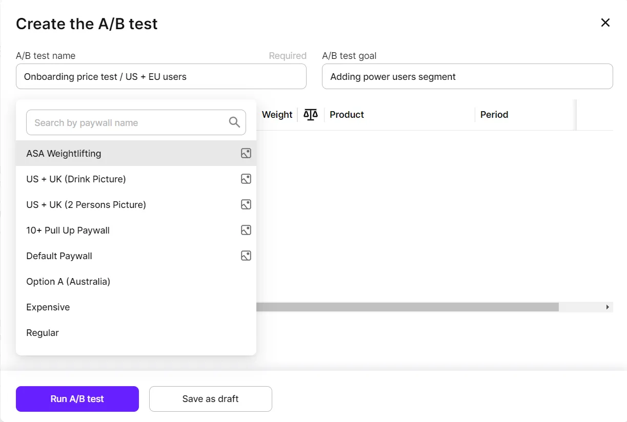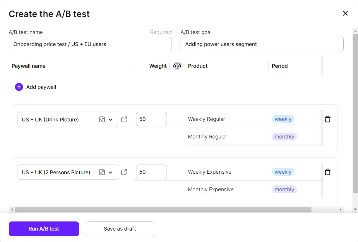 When creating a new A/B test, you must have at least two paywalls in it. Each paywall in the test will have a weight, which represents the relative amount of users it will receive during the test.