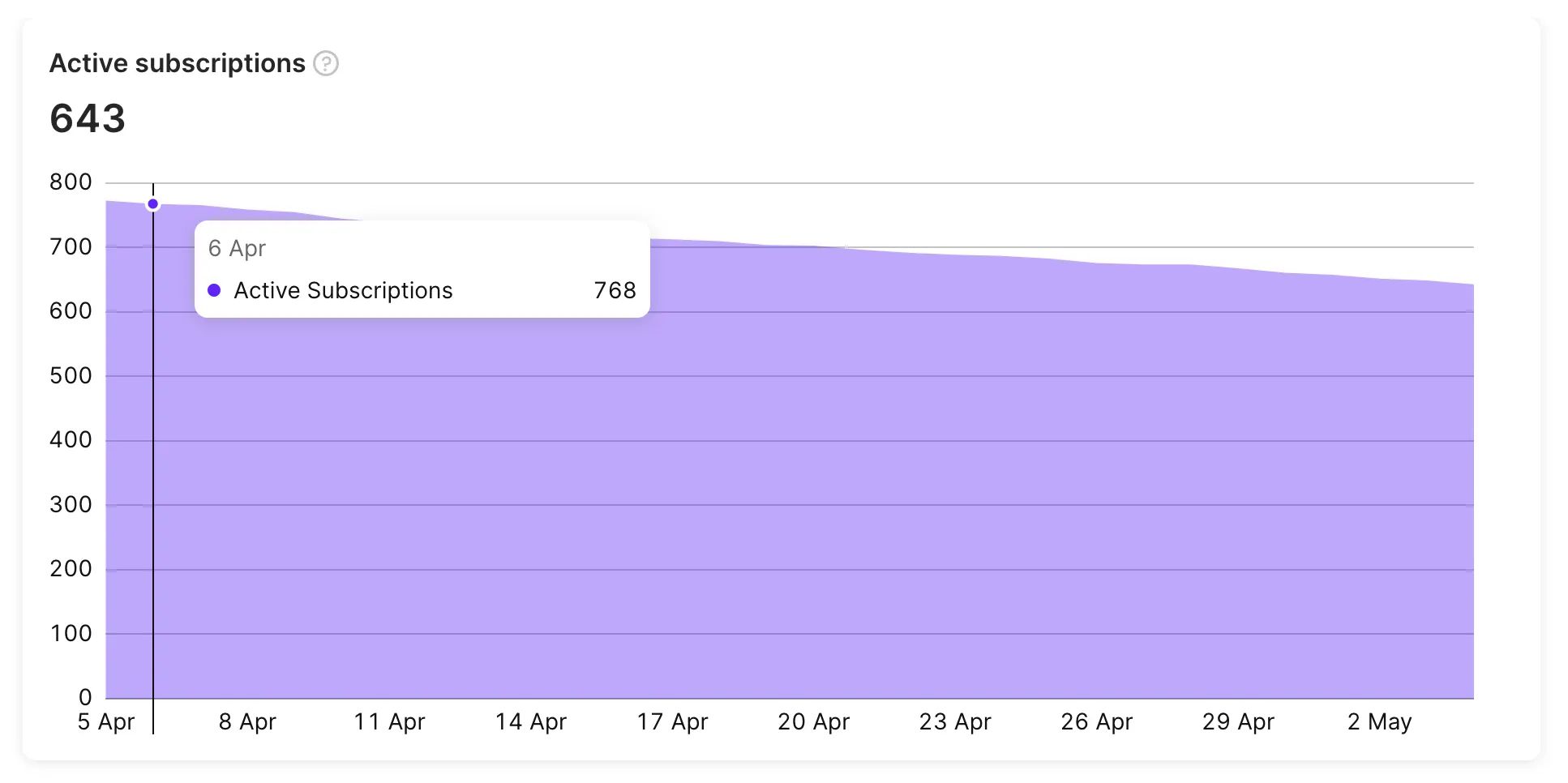 The Active subscriptions chart is useful to get valuable insights into the number of recurring, individual paid users from your app. This metric serves as a proxy for the size and growth potential of a business. Combining Active Subscriptions with filters and grouping helps you to gain a deeper understanding of their paid subscriber base composition, making it a powerful tool for data analysis.