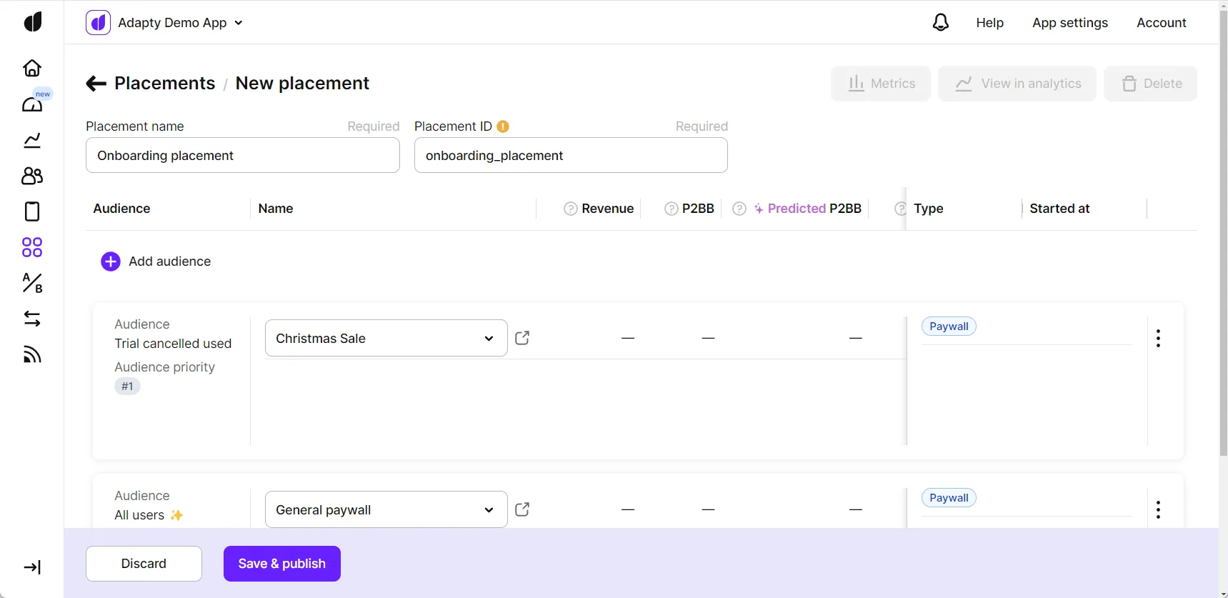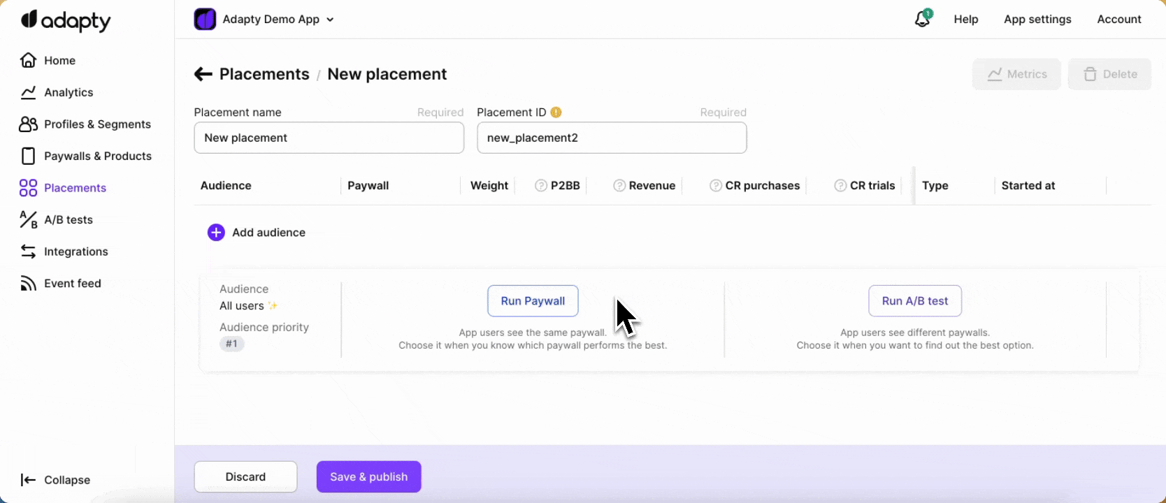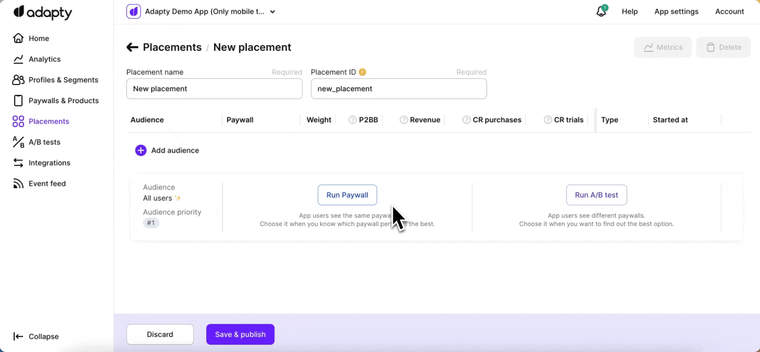 Add audience and paywall or A/B test to placement