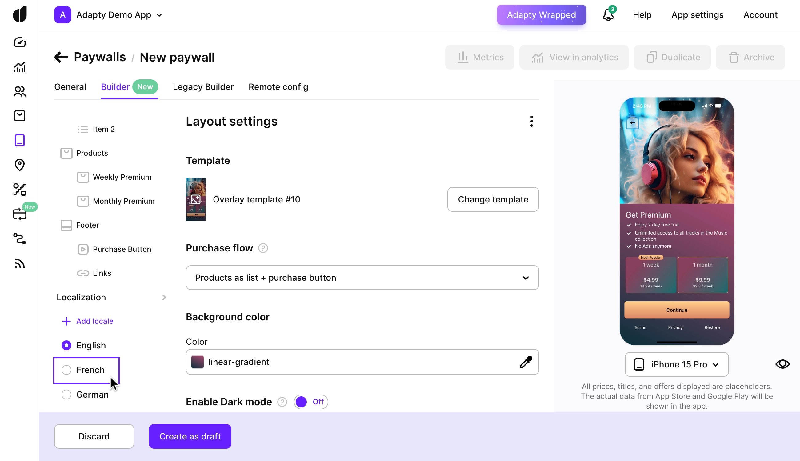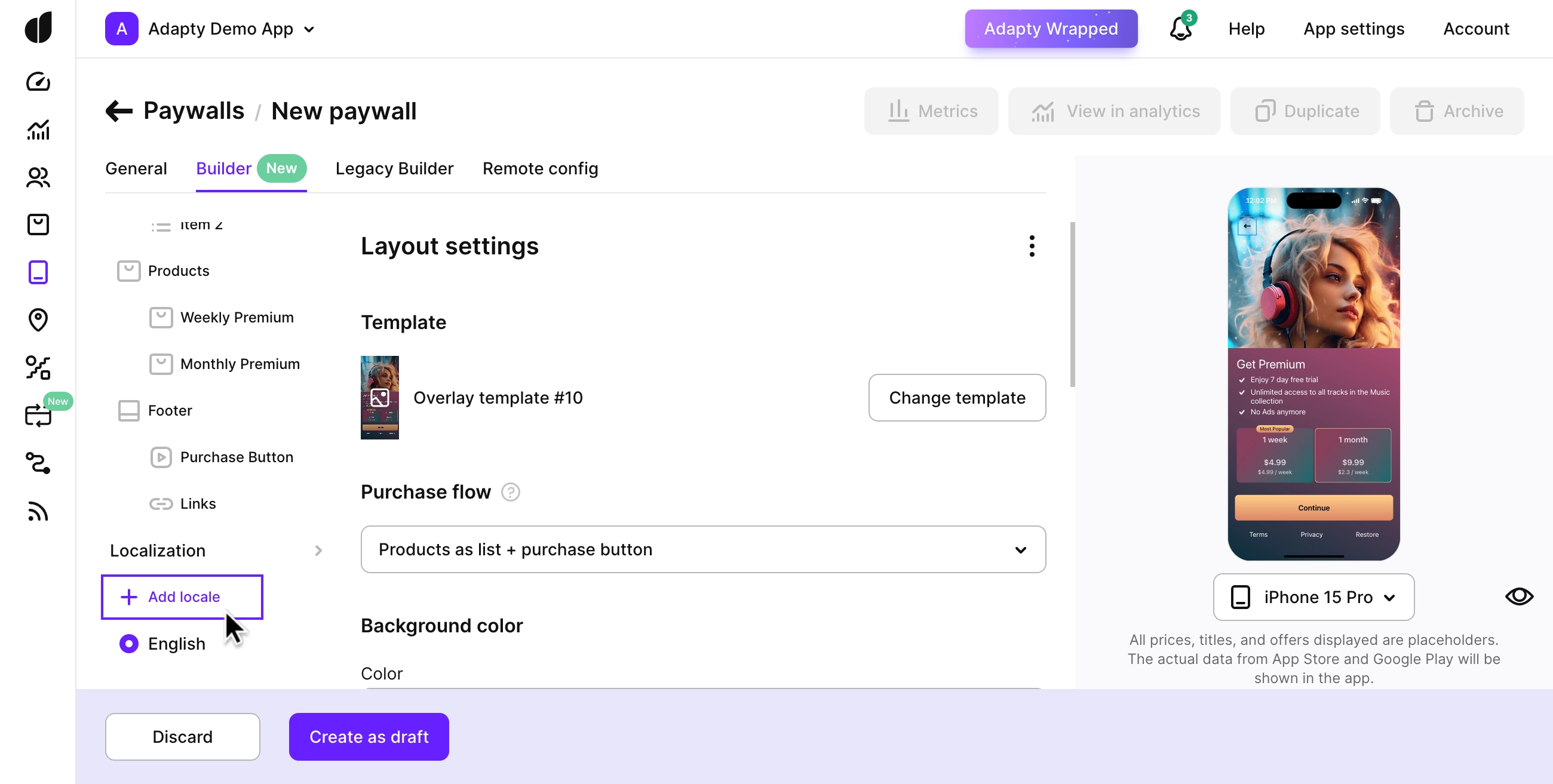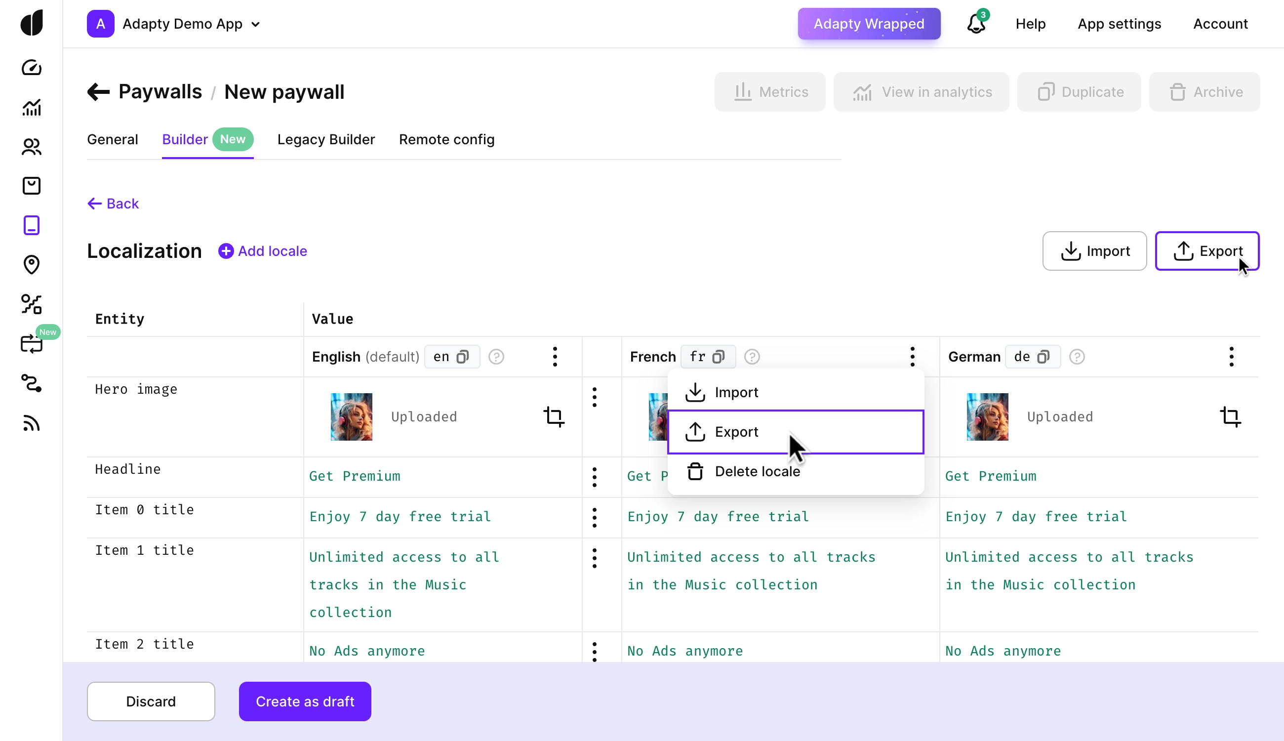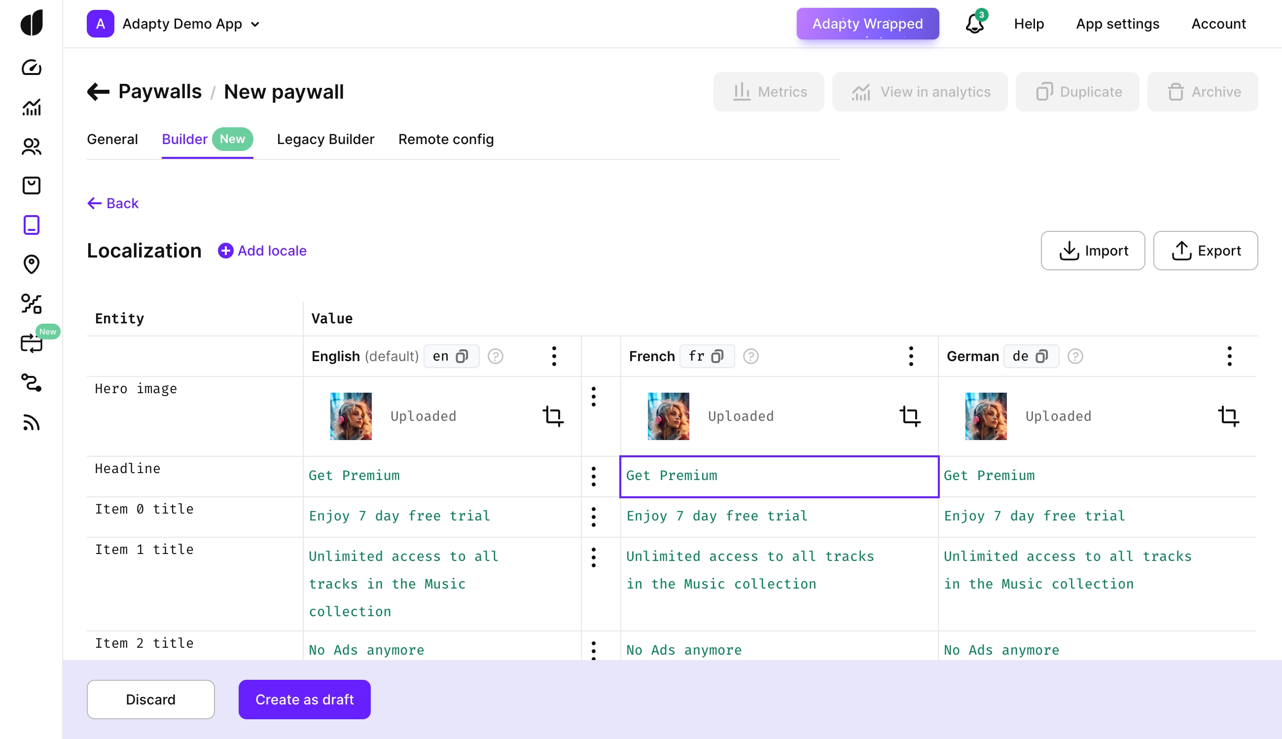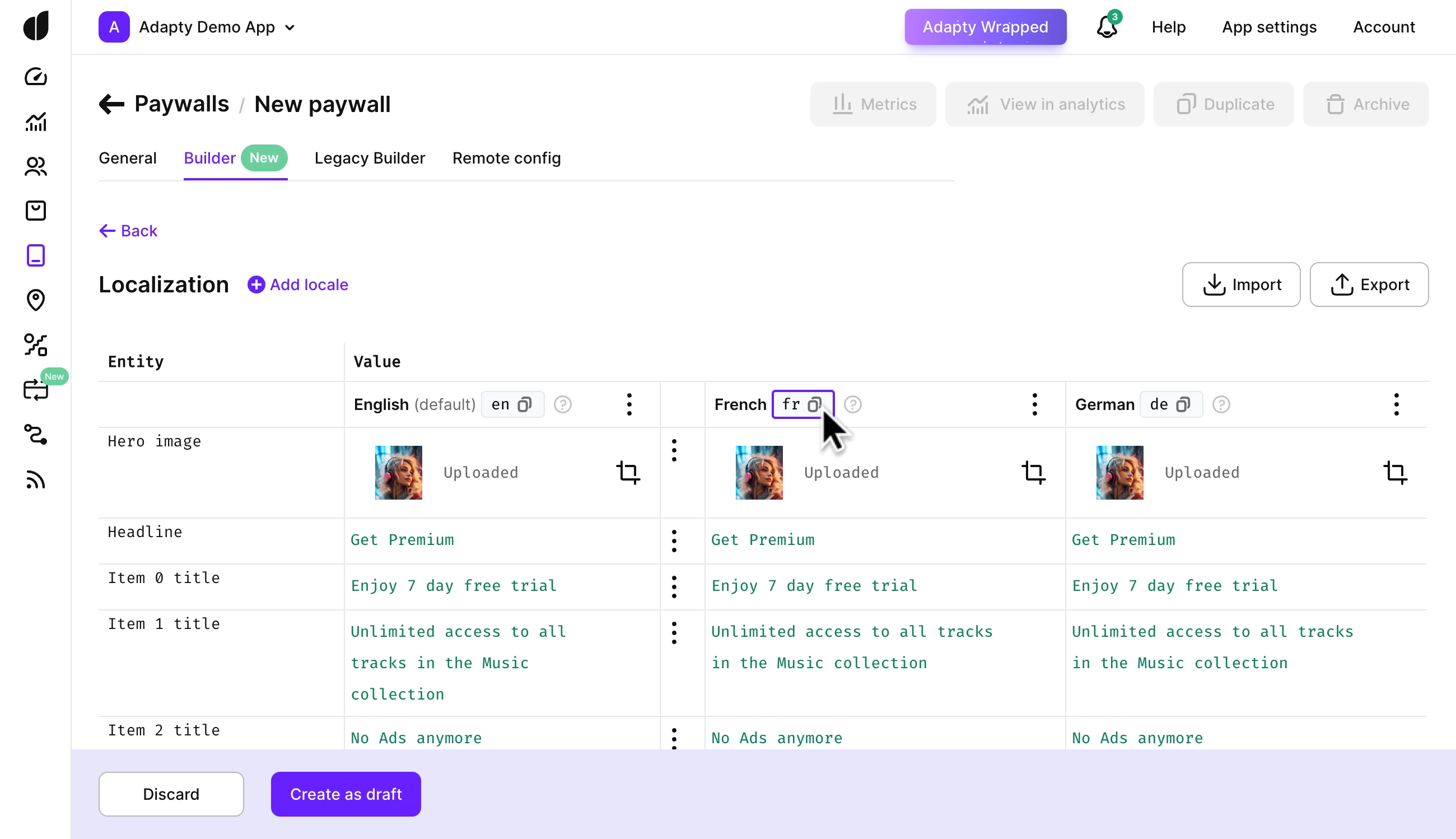 Suppose you've finished configuring your paywall in the default en localization and you like the result. Now it's time to add another language.