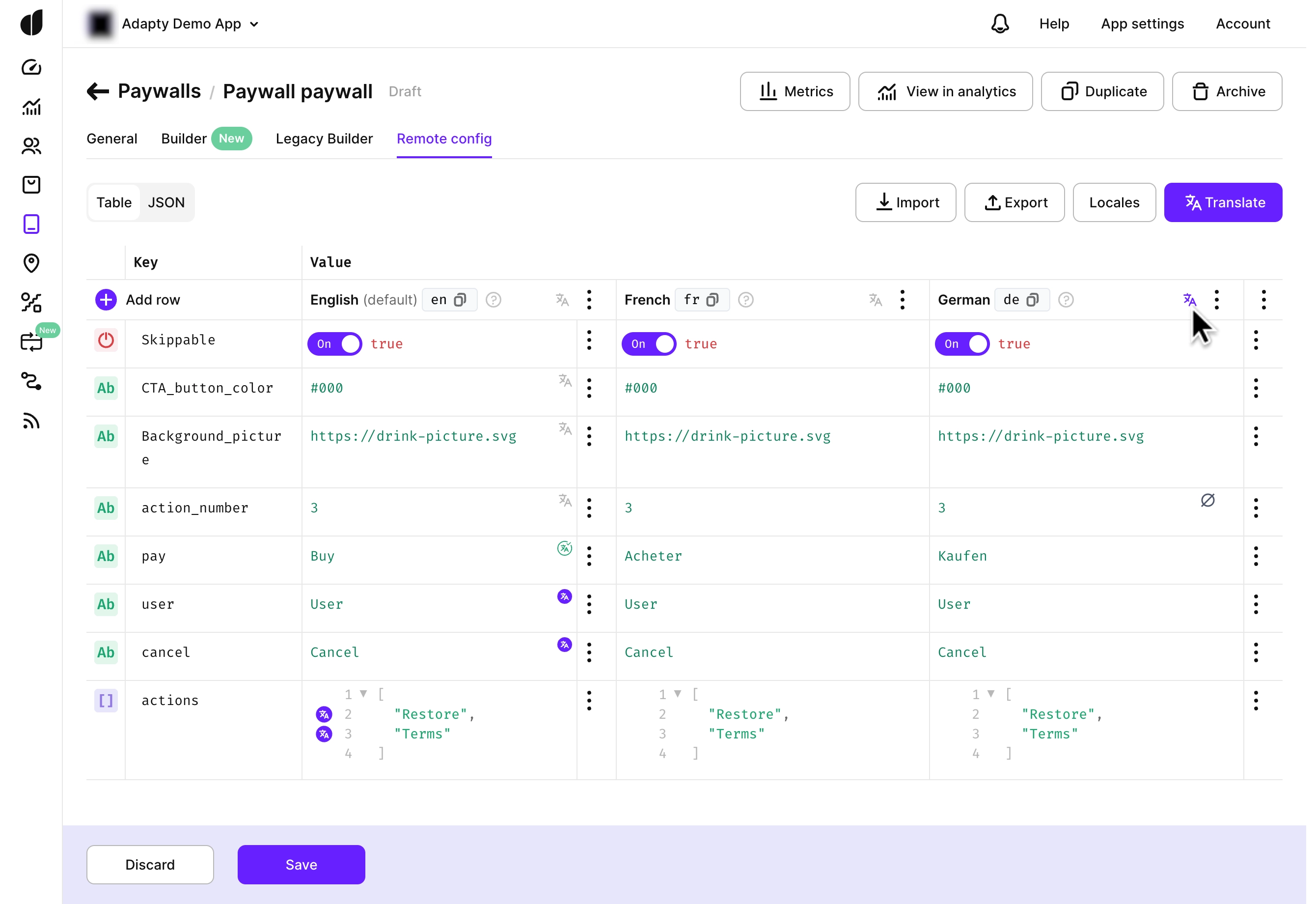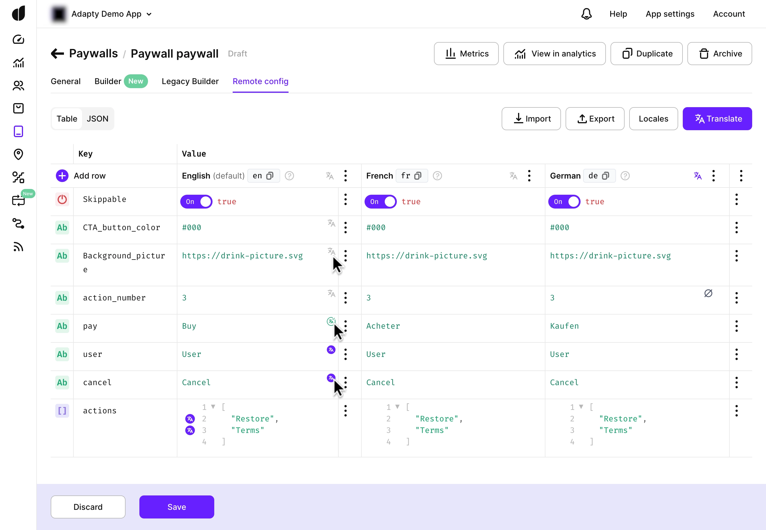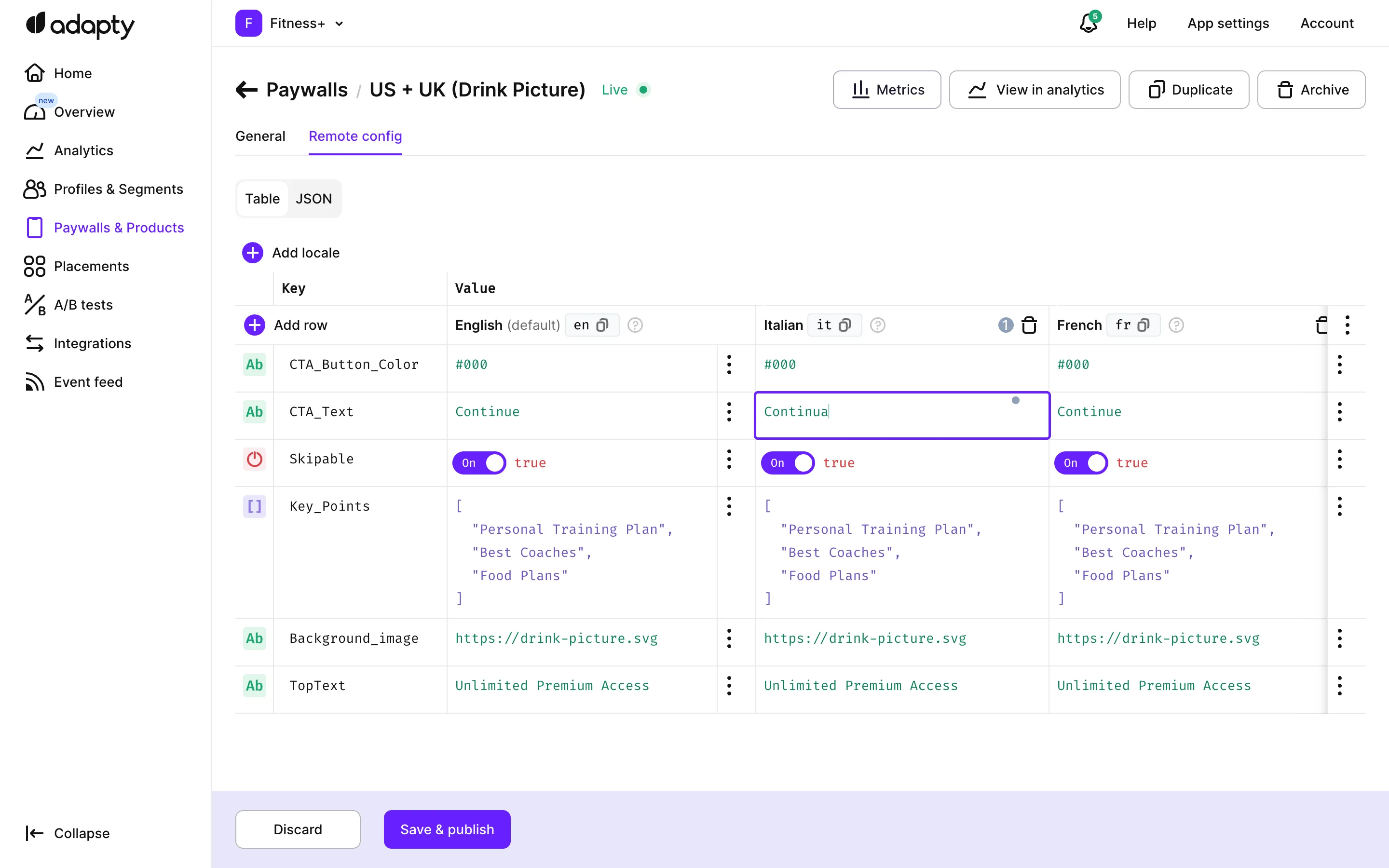 If you’ve designed a paywall using remote config, you can use the same remote config to set up localizations. Whether in table view or JSON format, you can easily adjust settings for each language. For example, translate string keys, toggle Boolean values (e.g., TRUE for English, FALSE for Italian), or even swap out background images. With this flexibility, you keep your core setup while tailoring the user experience for different languages.