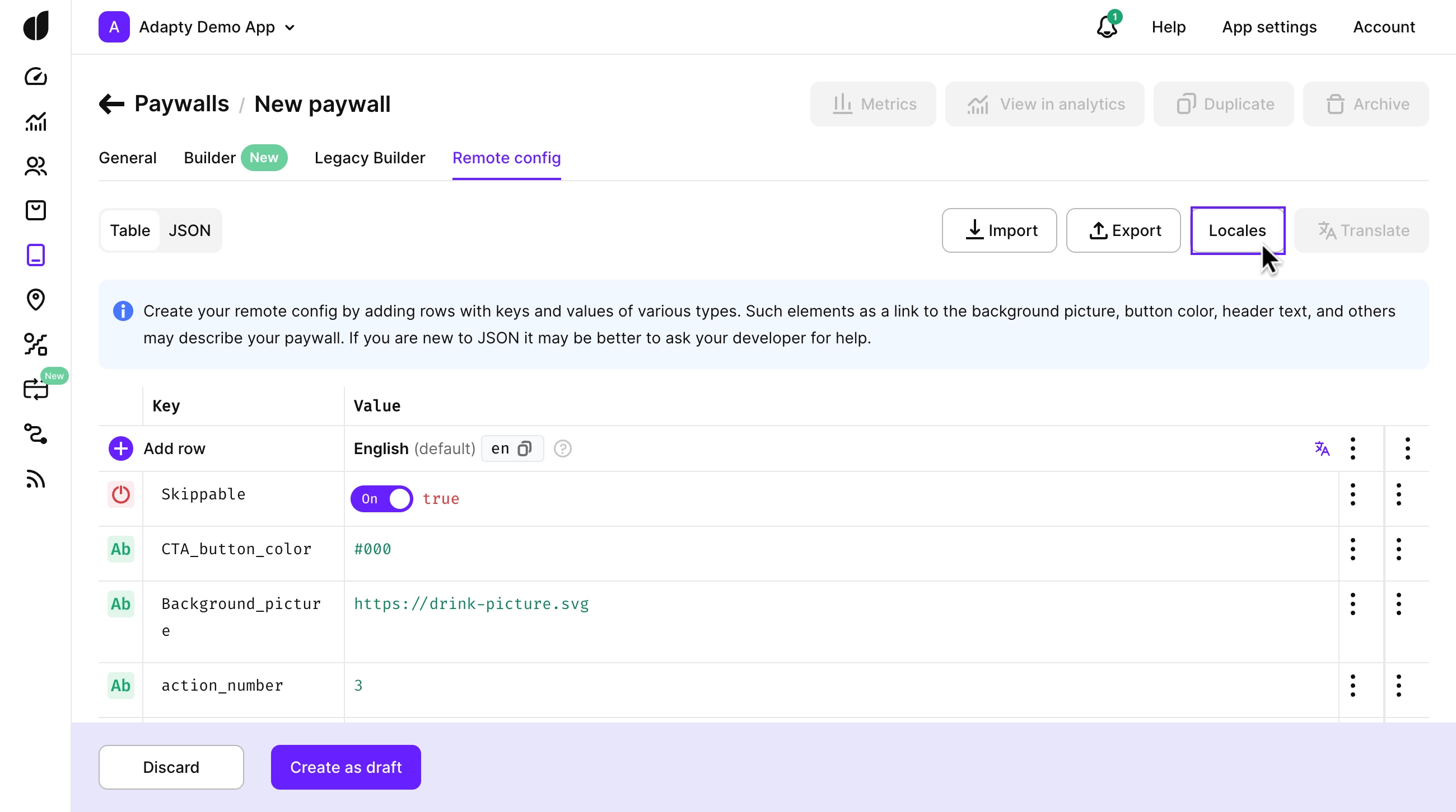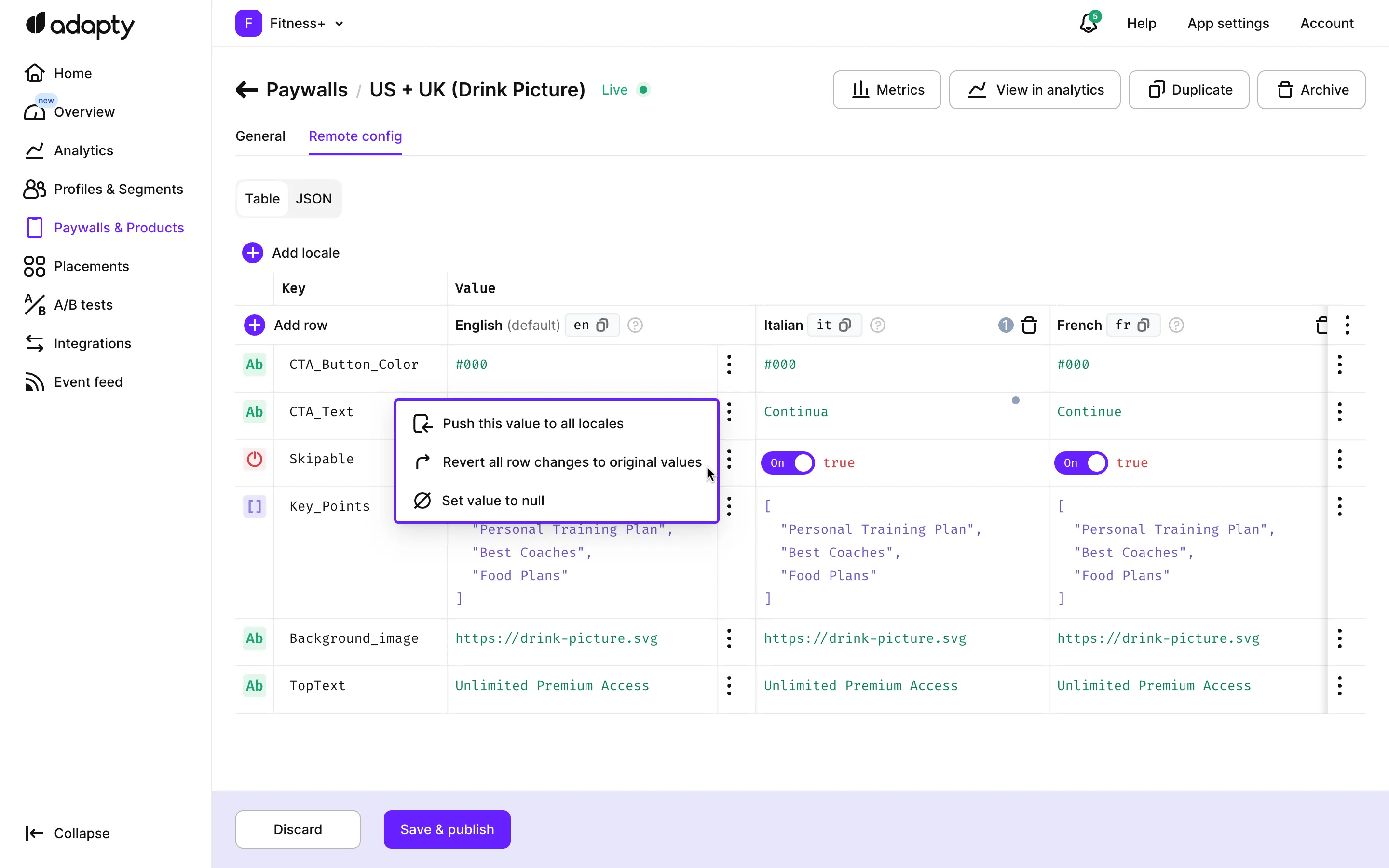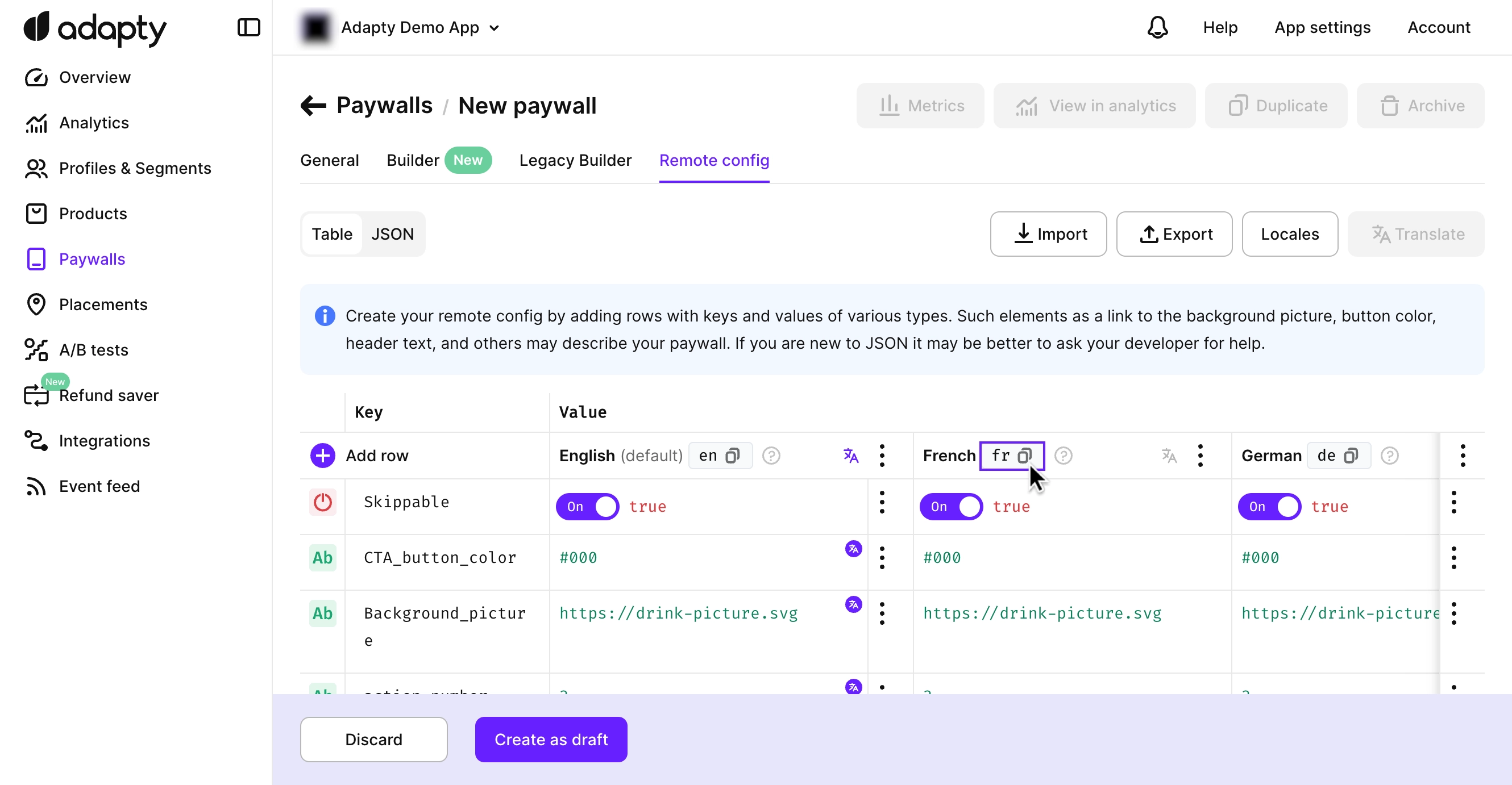 If you’ve designed a paywall using remote config, you can use the same remote config to set up localizations. Whether in table view or JSON format, you can easily adjust settings for each language. For example, translate string keys, toggle Boolean values (e.g., TRUE for English, FALSE for Italian), or even swap out background images. With this flexibility, you keep your core setup while tailoring the user experience for different languages.