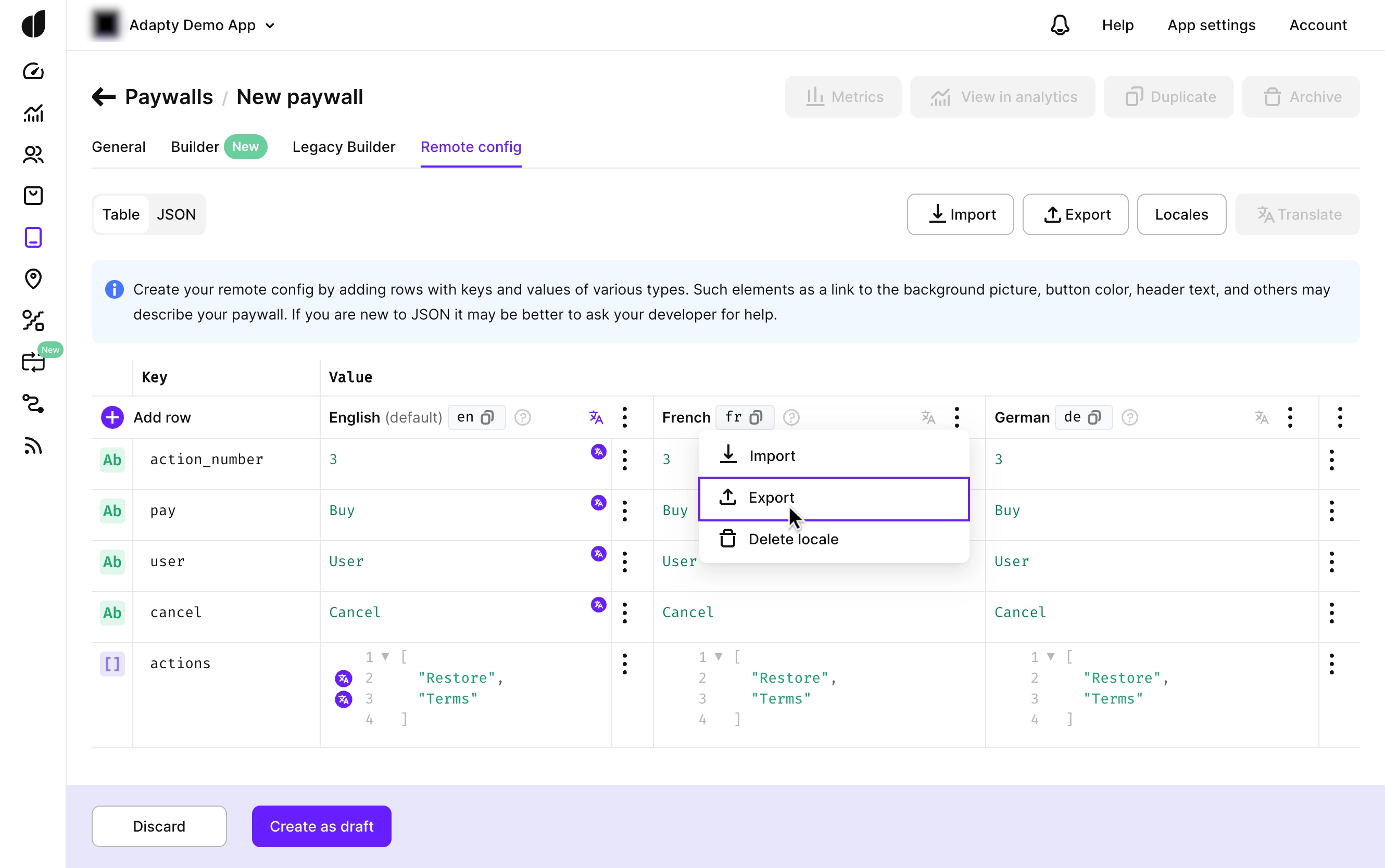 While AI-powered localization is becoming a popular trend, you might prefer a more reliable method, like using professional human translators or a translation agency with a strong track record. If that’s the case, you can export localization files to share with your translators and then import the translated results back into Adapty.