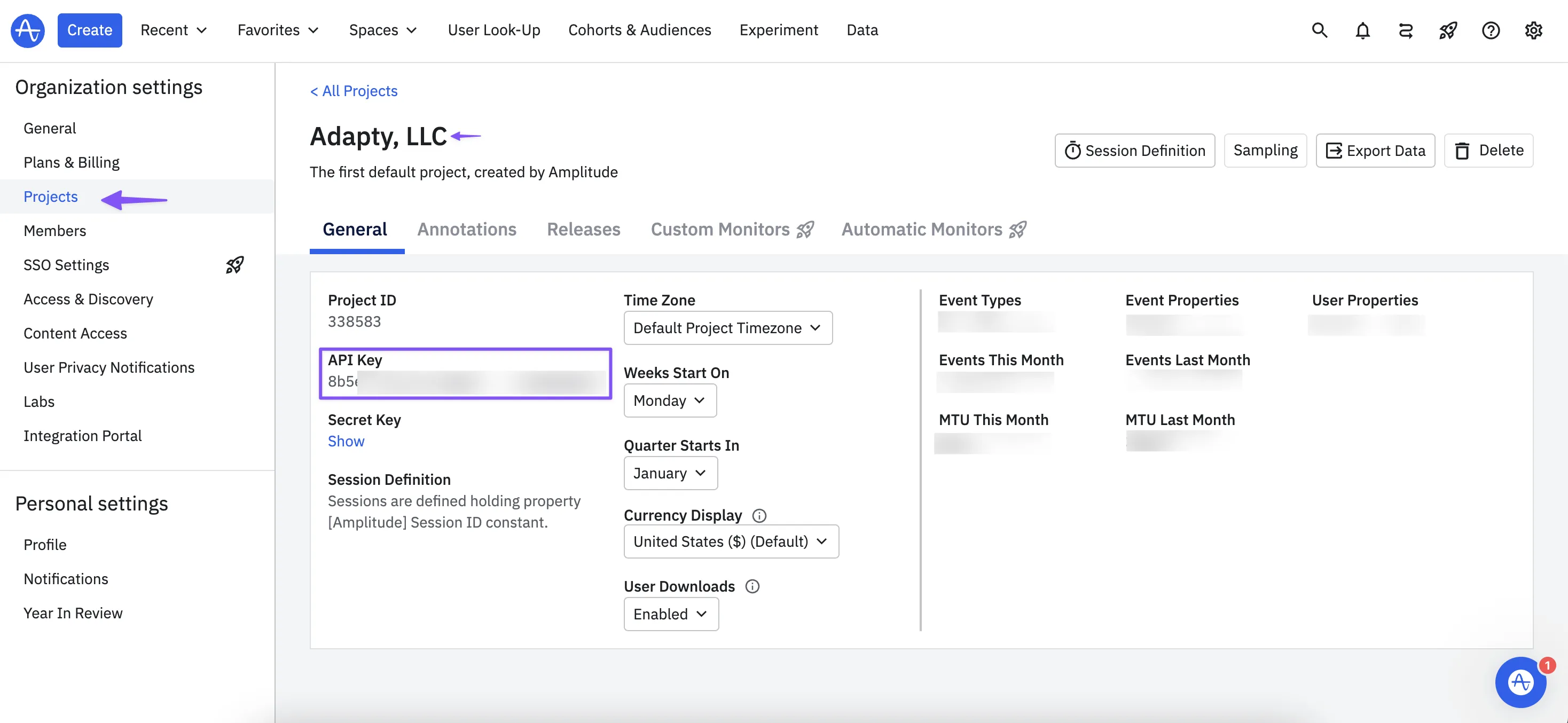 Field Description Amplitude iOS/ Android/ Stripe API key Enter the Amplitude API Key for iOS/ Android/ Stripe into Adapty. Locate it under Project settings in Amplitude. For help, check Amplitude docs. Start with Sandbox keys for testing, then switch to Production keys after successful tests.