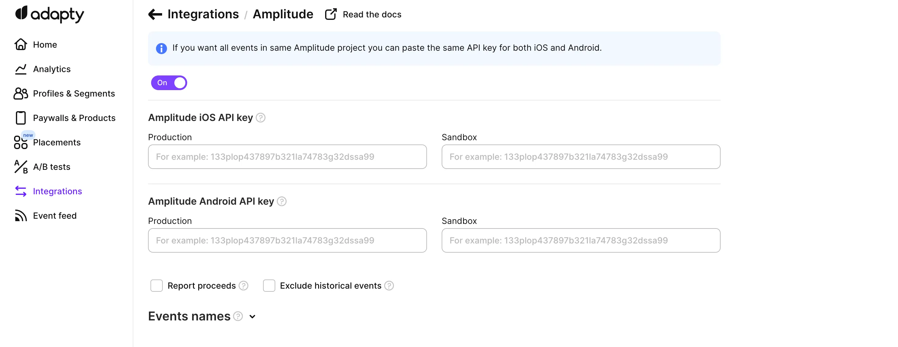 - Open Integrations -> Amplitude in your Adapty Dashboard.