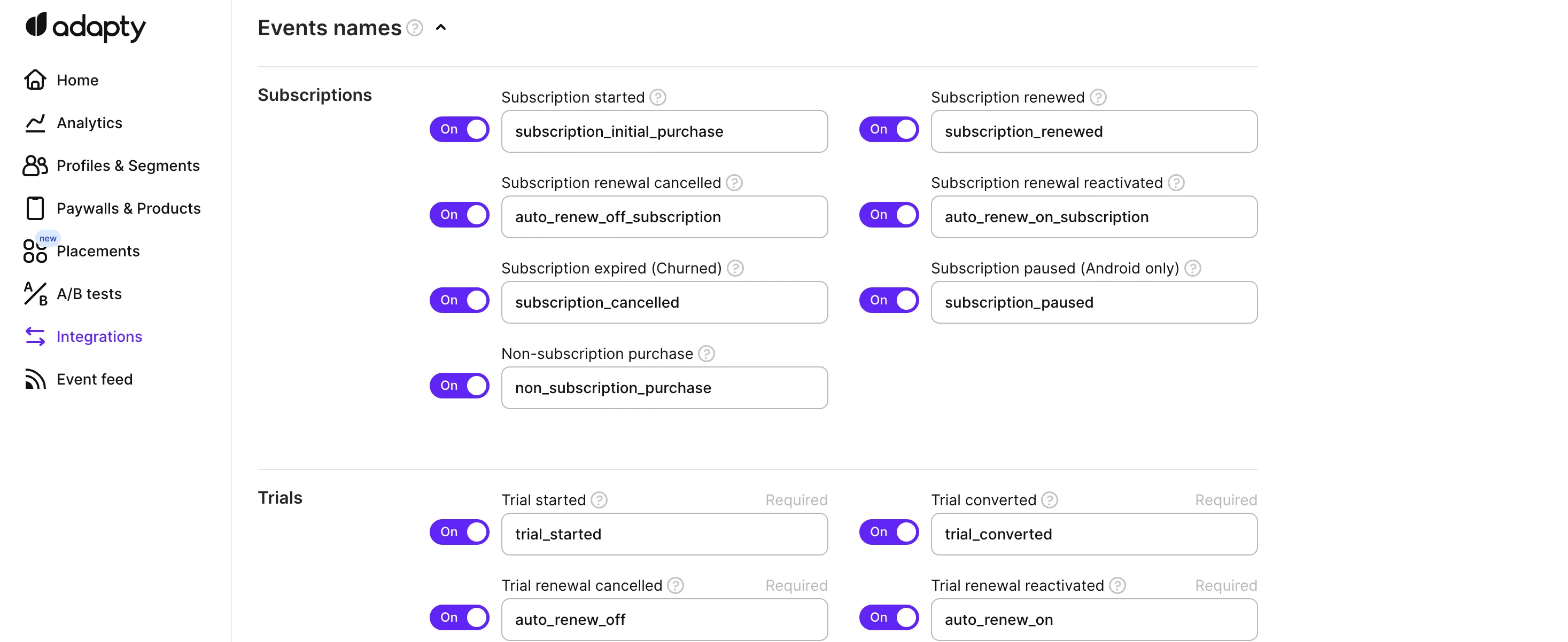 We recommend using the default event names provided by Adapty. But you can change the event names based on your needs. Adapty will send subscription events to Amplitude using a server-to-server integration, allowing you to view all subscription events in your Amplitude dashboard.