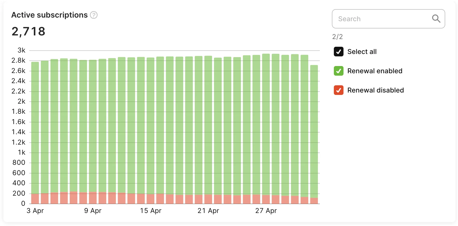 The number of active subscriptions segmented by renewal status, which indicates whether or not this subscription will be renewed in the next period.
