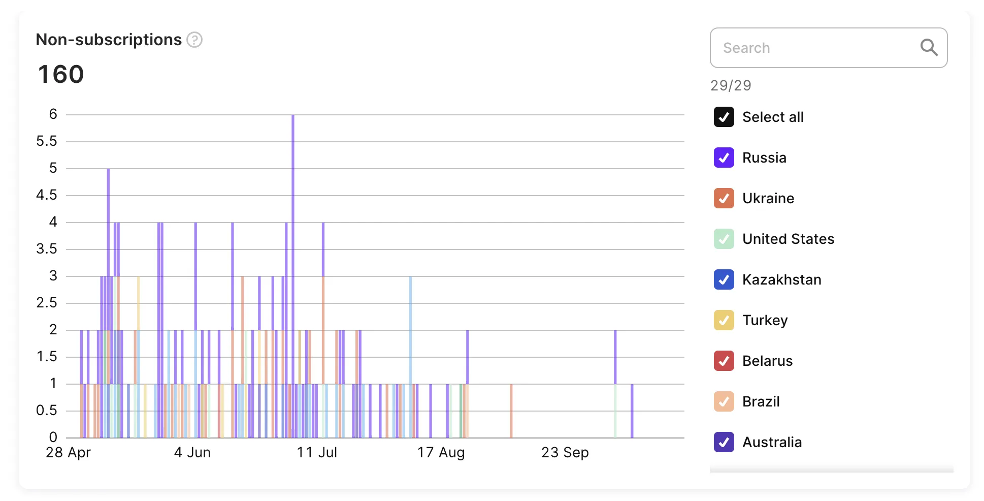 The Non-subscriptions chart displays the number of in-app purchases such as consumables, non-consumables, and non-renewing subscriptions. The chart doesn't include renewable payments. The chart shows the total count of these types of in-app purchases and can help you track user behavior and engagement over time.
