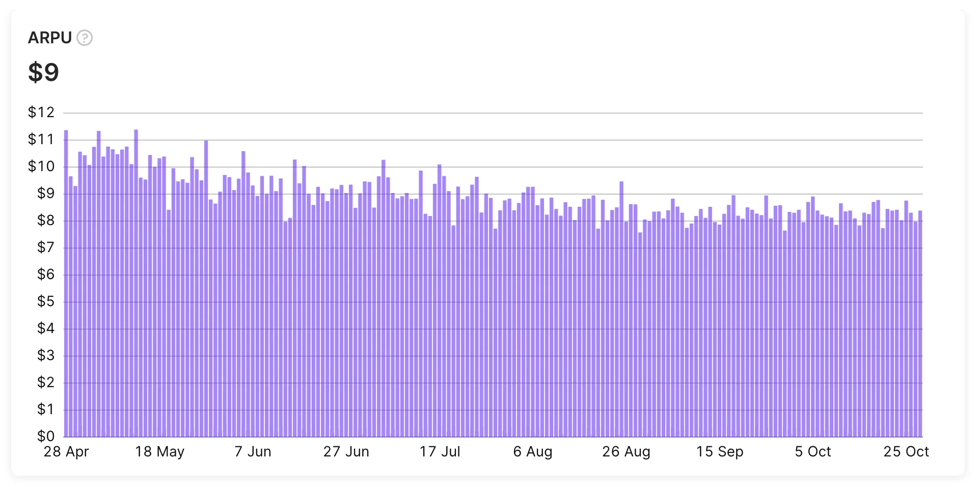 ARPU chart displays the average revenue per user (ARPU) for your app. ARPU is calculated as revenue for a given period / users (non-unique installs) for the same period. For example, if your app generates $10,000 in revenue in a day and has 1,000 new users on that day, the ARPU for that day would be $10 ($10,000/1,000).