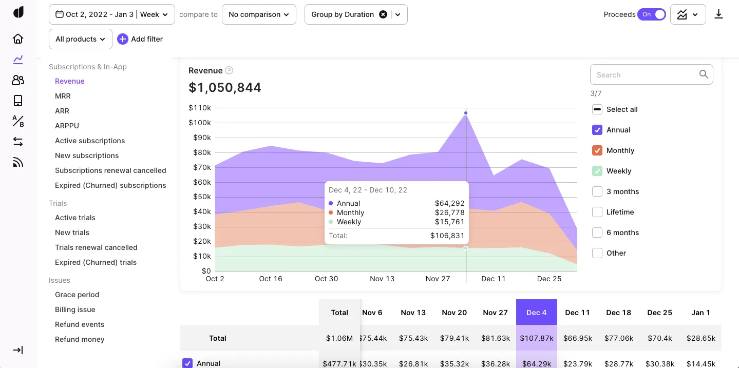Filter metrics by product (both subscriptions and one-time purchases are available).