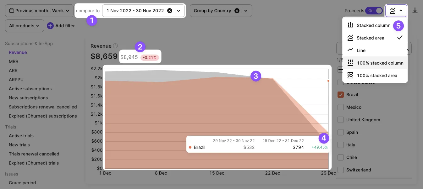 For all the charts in Adapty, you can use a range of controls to get more data-based insights.