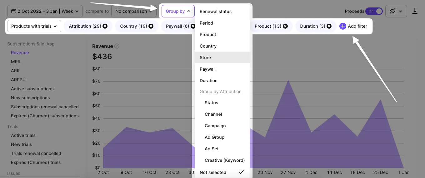 Install Adapty SDK and start analyzing real-time metrics of your iOS or Android app with advanced filters and grouping, such as ad network, ad campaign, country, paywall, product, and more.