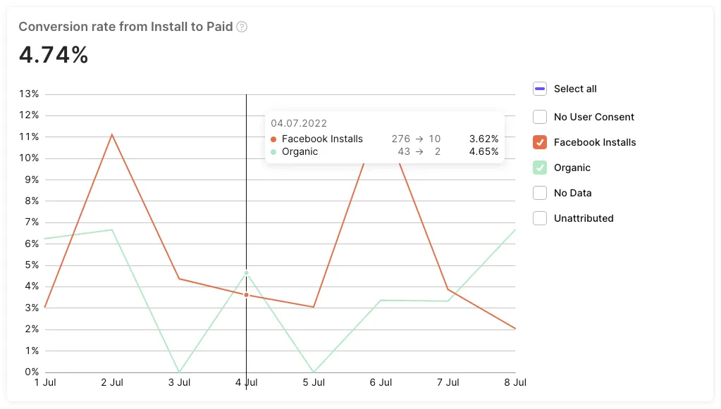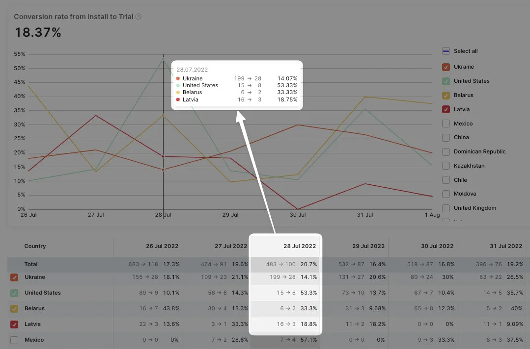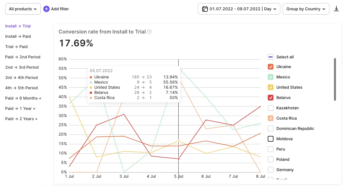 If Х - the number of installs (the same for all products because there is no product chosen at the stage of installation) for the selected date, and Y - the amount of those among Х who activated a trial (any possible time), then Conversion = (Y / X) _ 100%. For example, we had 100 installs on the 1st of January and among them 20 activated a trial the same week. On the 8th of January, we open the chart and see the conversion of the 1st of January (20 / 100) _ 100% = 20%. Then 30 more installs on the 1st of January activated a trial by the end of January. We open the chart on the 1st of February and see that the conversion of the 1st of January = ((20+30) / 100) * 100% = 50%. This number shows which part of those who had installed the app on the 1st of January converted to the trial by the current moment. -