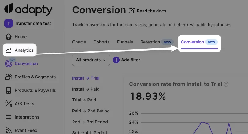 If Х - the number of installs (the same for all products because there is no product chosen at the stage of installation) for the selected date, and Y - the amount of those among Х who paid (any possible time) for the 1st subscription (directly, without trial), then Conversion = (Y / X) _ 100%. For example, we had 100 installs on the 1st of January and among them, 20 subscribed the same week. On the 8th of January we open the chart and see the conversion of the 1st of January = (20 / 100) _ 100% = 20%. Then 30 more installs of the 1st on January bought the 1st subscription without trial by the end of January. We open the chart on the 1st of February and see that the conversion of the 1st of January = ((20+30) / 100) * 100% = 50%. This number shows which part of those who had installed the app on the 1st of January converted to the 1st subscription without trial by the current moment. -