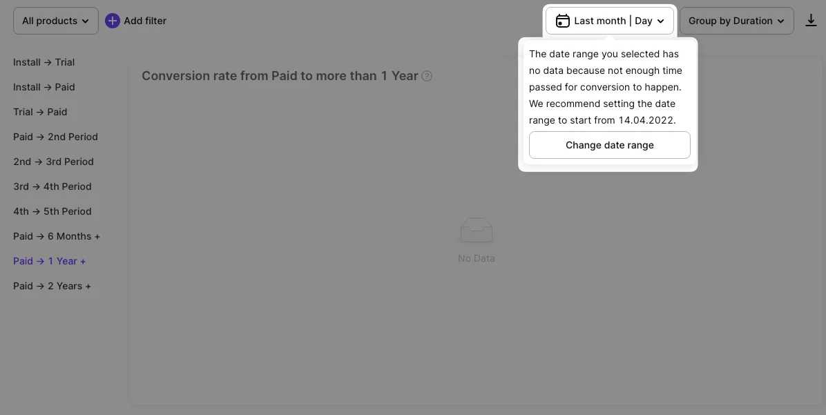 If Х - the number of the 1st subscriptions taken during the selected date, and Y - the amount of the 2nd subscriptions taken after them any time later (normally the product duration time though grace period cases are also counted), then Conversion = (Y / X) _ 100%. For example, we had 100 1st subscriptions of various products on the 1st of January and among them 20 renewed in a week. On the 8th of January, we open the chart and see the conversion of the 1st of January = (20 / 100) _ 100% = 20%. Then 30 more subscribers of the 1st of January renewed by the start of February. We open the chart on the 1st of February and see that the conversion of the 1st of January = ((20+30) / 100) * 100% = 50%. This number shows which part of those who had their 1st payment on the 1st of January converted to the 2nd subscription by the current moment. -