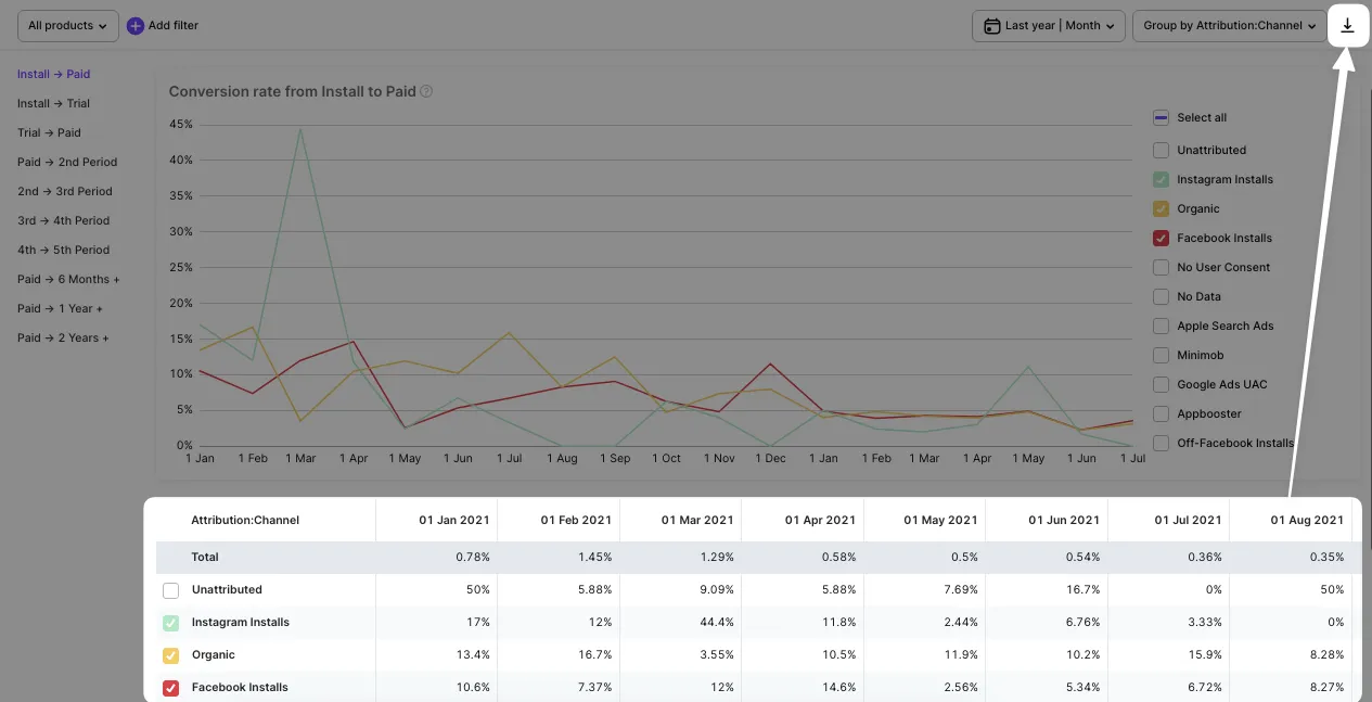 The grouping that was mentioned above changes both the charts and the table. Set quick filter by product or use other advanced ones, including Product, Country, Store, Duration, Attribution.