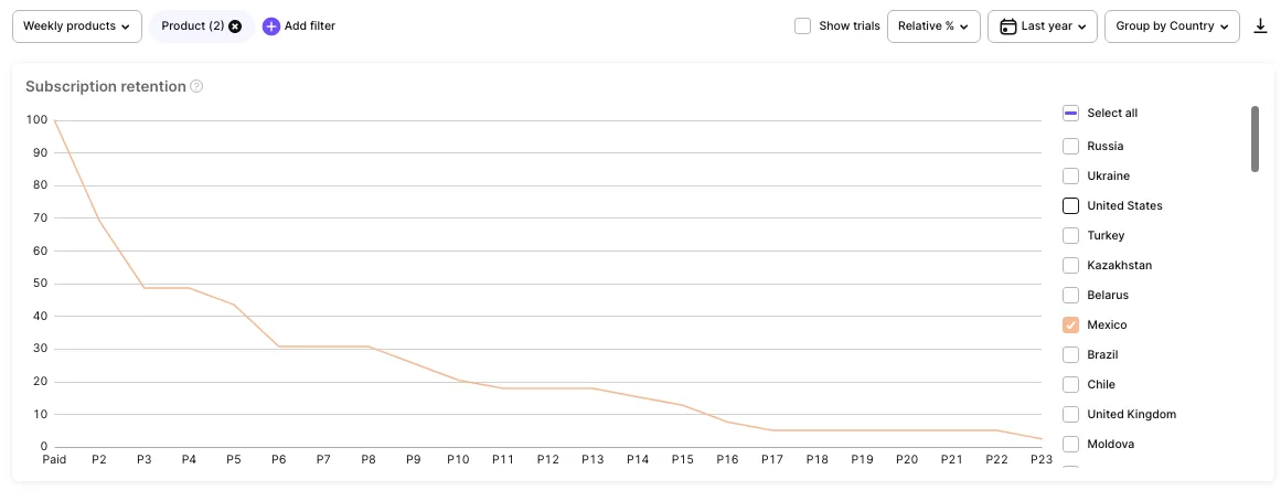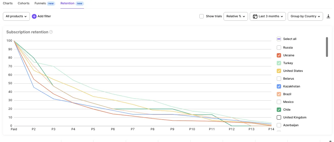 Moving faster than the main competitors is good but sometimes jumping out of the ordinary race may bring more benefits. When you analyze the behavior of users in different countries and stores, some local peculiarities can open outstanding insights and new opportunities for the business. Cultural and market context can be analyzed from the perspective of retention to be later used for segmentation and further development. For example, you may find blue water in some regions and grow there faster.