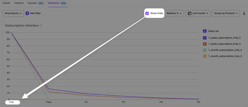 The steps are shown on the horizontal axis: Trial, Paid (the 1st subscription), P2 (the 2nd subscription), P3, P4, etc