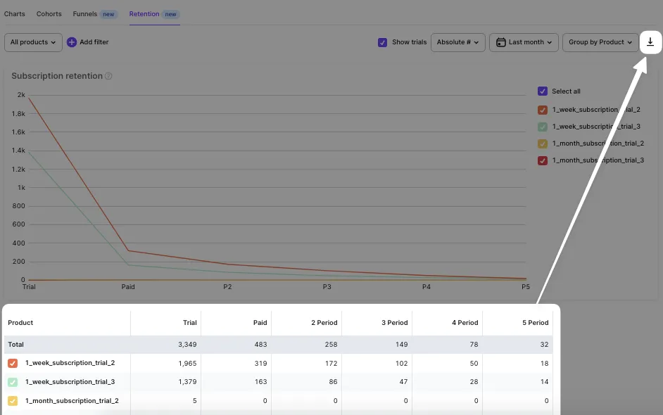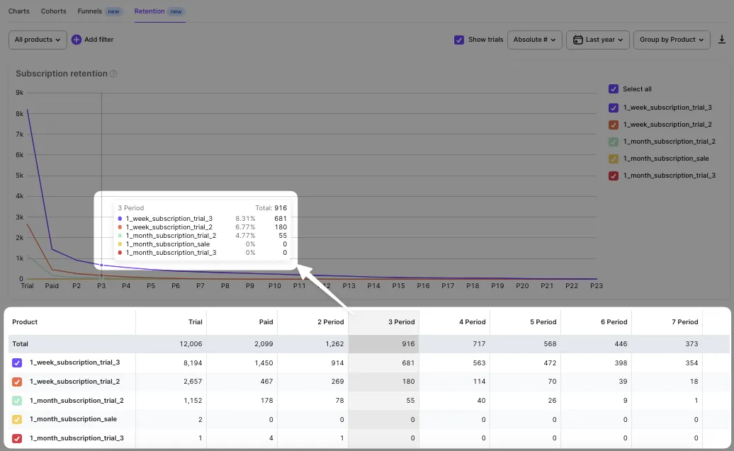 For example, you've selected the last 3 months in the calendar, and the checkbox "show trials" is unchecked. This means we count only those who have had their 1st subscription during the last 3 months. If the checkbox "show trials" is checked and the 3 last months are selected in the calendar we count all those who have had their trials during the last 3 months. For these subscribers, we show the absolute retention for the Nth step as the number of those who have had the Nth payment. And we calculate a relative value of retention for the Nth step as a ratio of the absolute amount of the Nth payment to the total amount of subscriptions (or trials) during the selected time range.