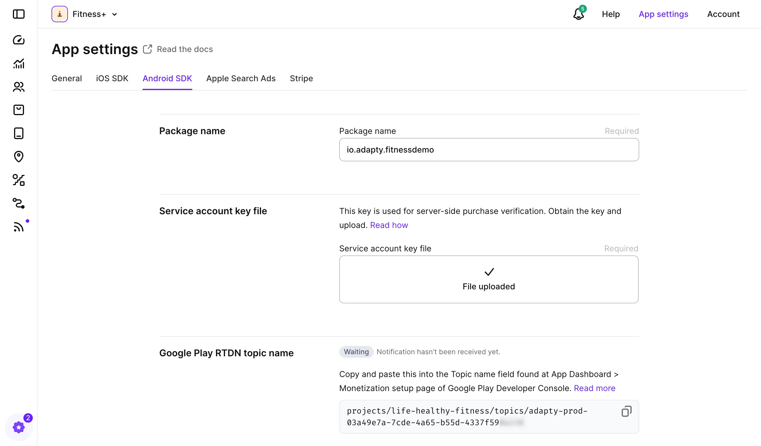 | Package name | The Package name is the unique identifier of your app in the Google Play Store. This is required for the basic functionality of Adapty, such as subscription processing. |