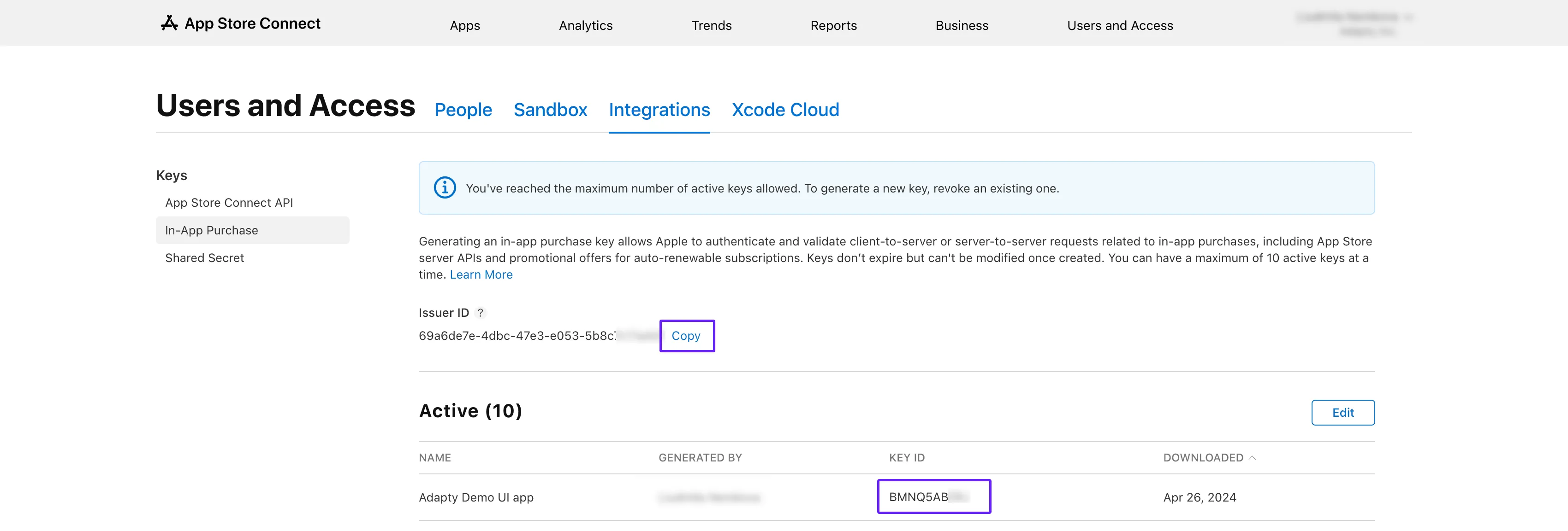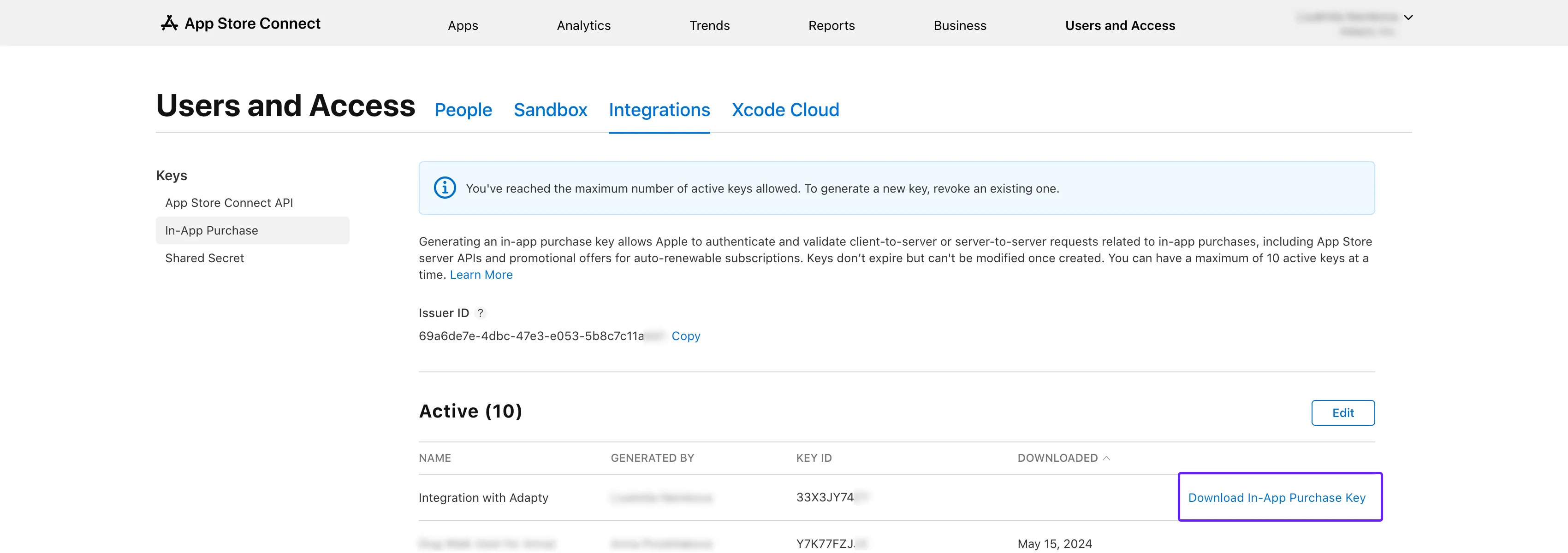 In the **Active **list, find the key you've created in the Generate In-App Purchase Key in App Store Connect section.