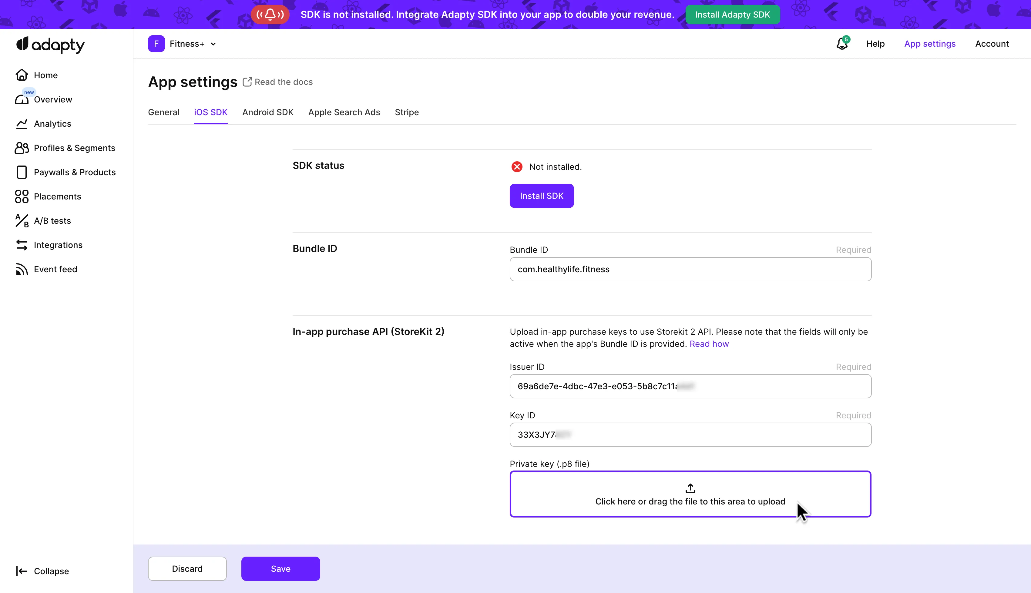 into the Private key (.p8 file) and Subscription (.p8 file) fields in the Adapty Dashboard.