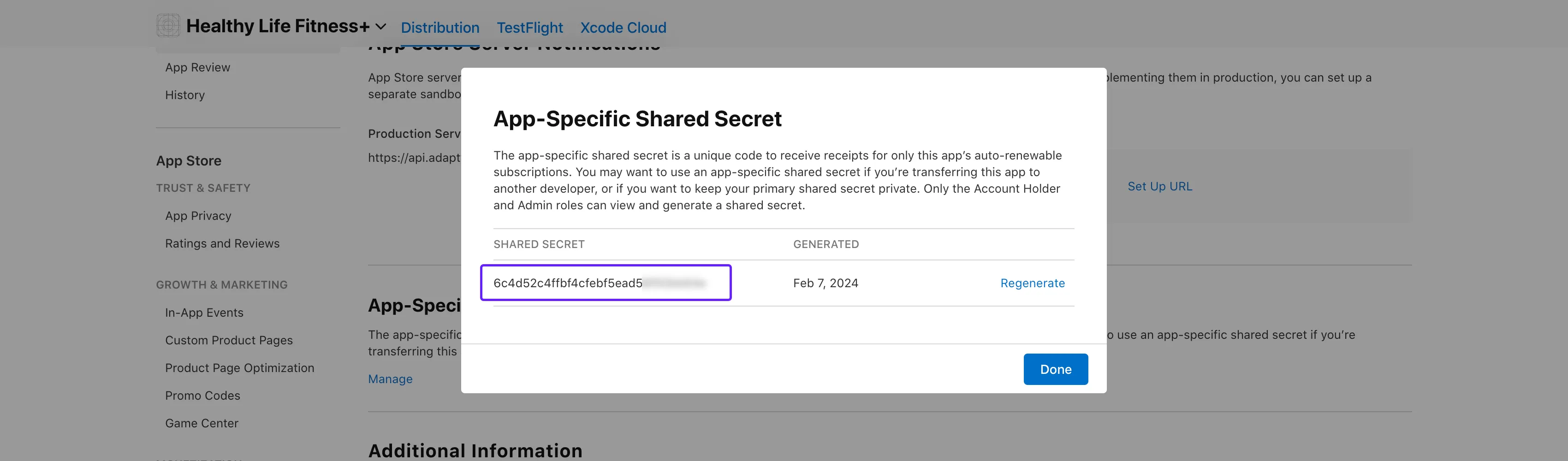 In the opened App-Specific Shared Secret window, copy the Shared Secret. If no shared secret is visible, first click either the Manage or Generate button whichever is available, and then copy the Shared Secret.