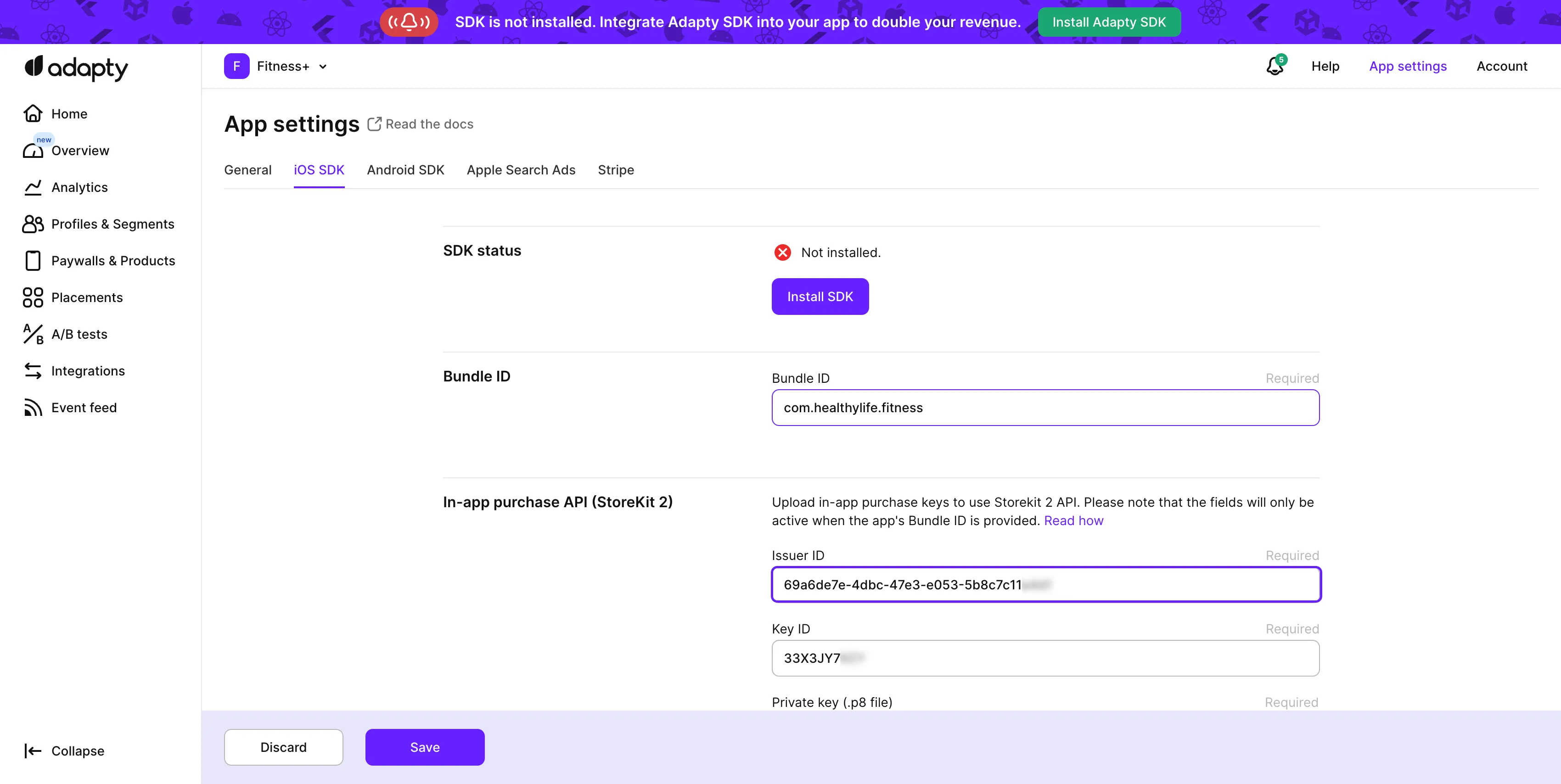 Open the App settings -> iOS SDK tab from the Adapty top menu.