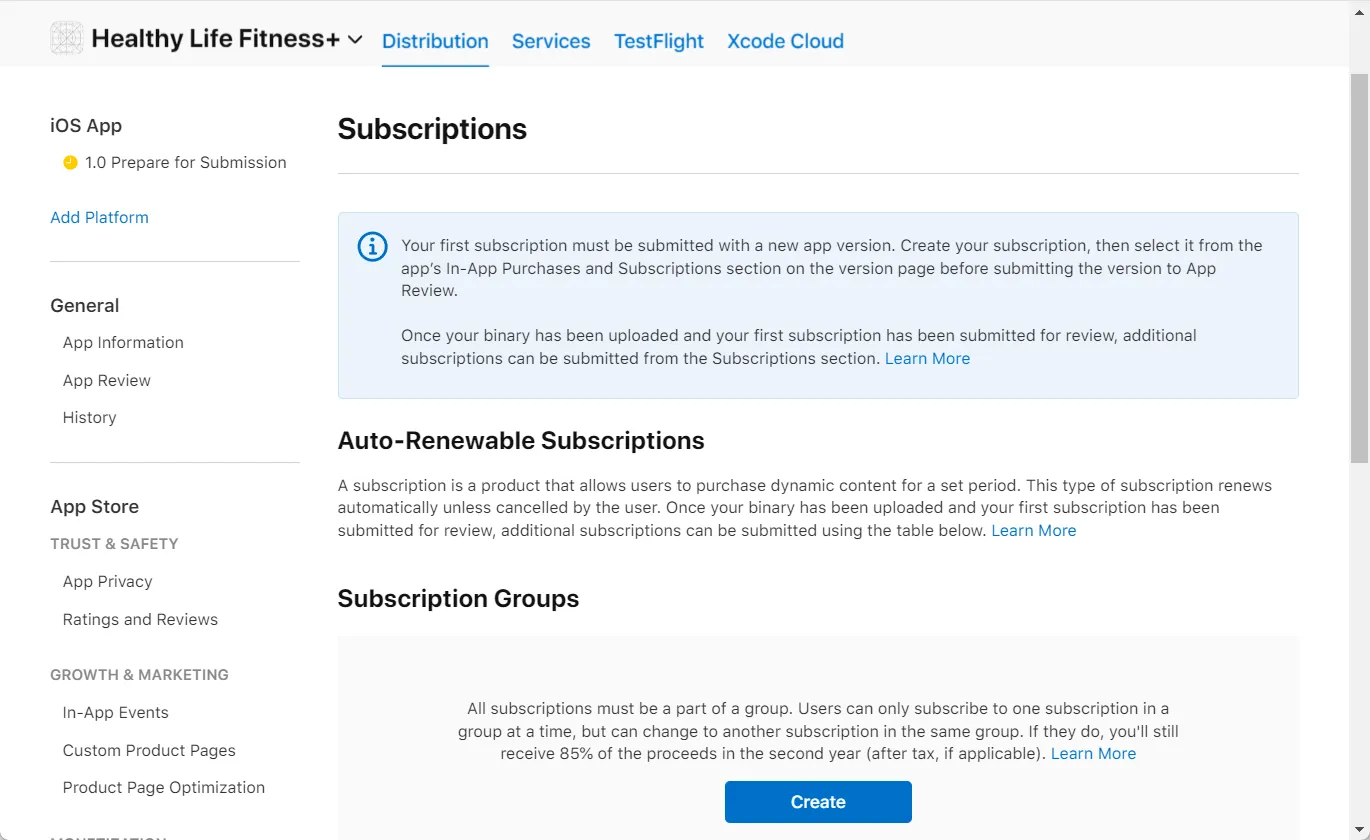 If you haven't created a subscription group, click the Create button under the Subscription Groups title to initiate the process. Subscription Groups in App Store Connect categorize and manage your products, allowing users to switch between different offerings seamlessly. Note that it's not possible to create a subscription outside of a group.