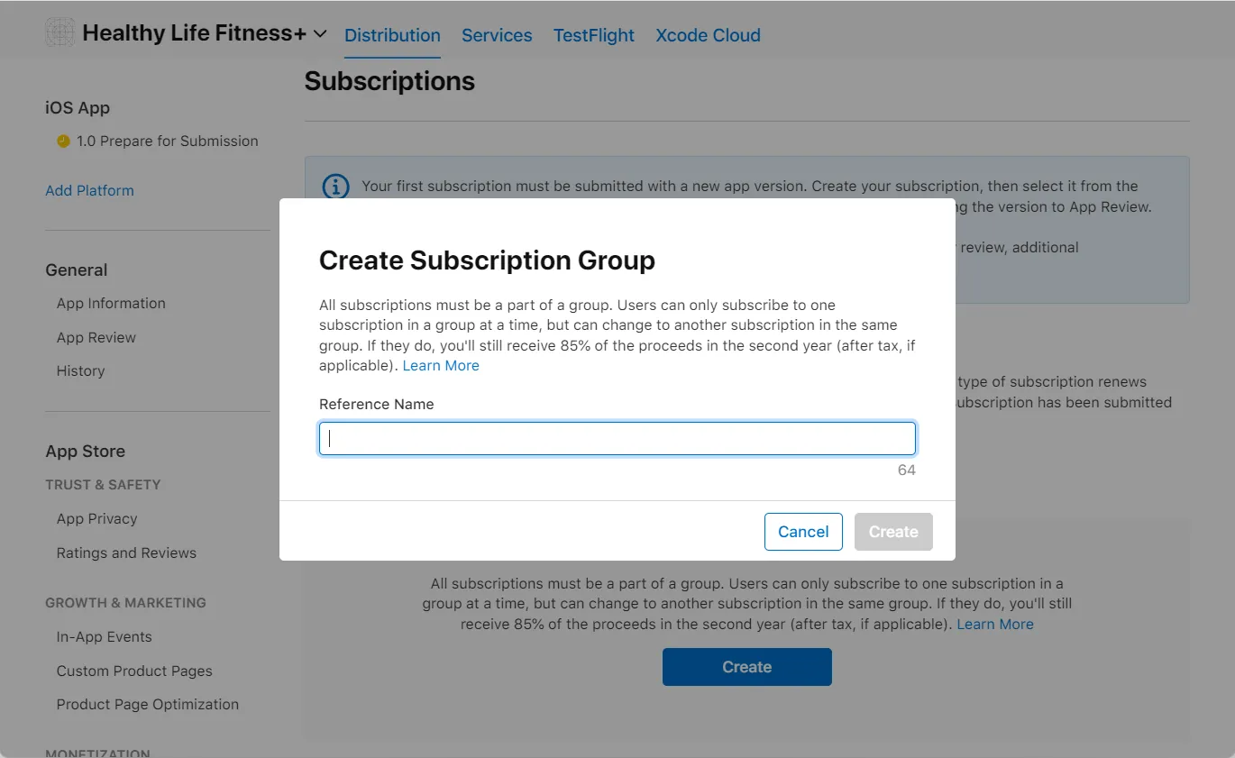In the opened Create Subscription Group window, enter a the new subscription group name in the Reference Name field. The reference name is a user-defined label or identifier that helps you distinguish and manage different subscription groups within your app.
