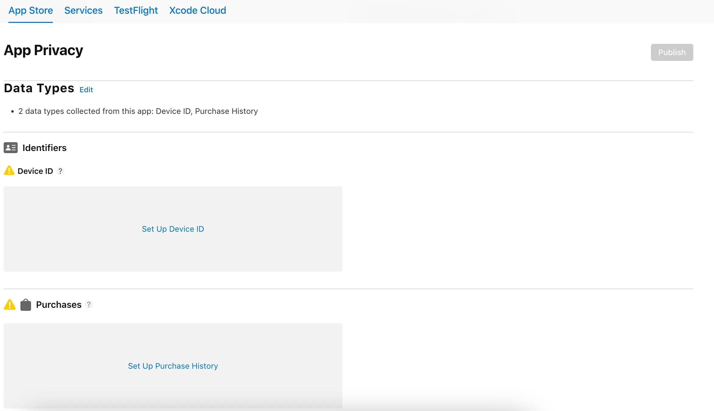 After making your privacy selections, Apple will show a preview of your app's privacy section. If you have chosen Purchases and Identifiers as described above, your app's privacy details should look something like this: