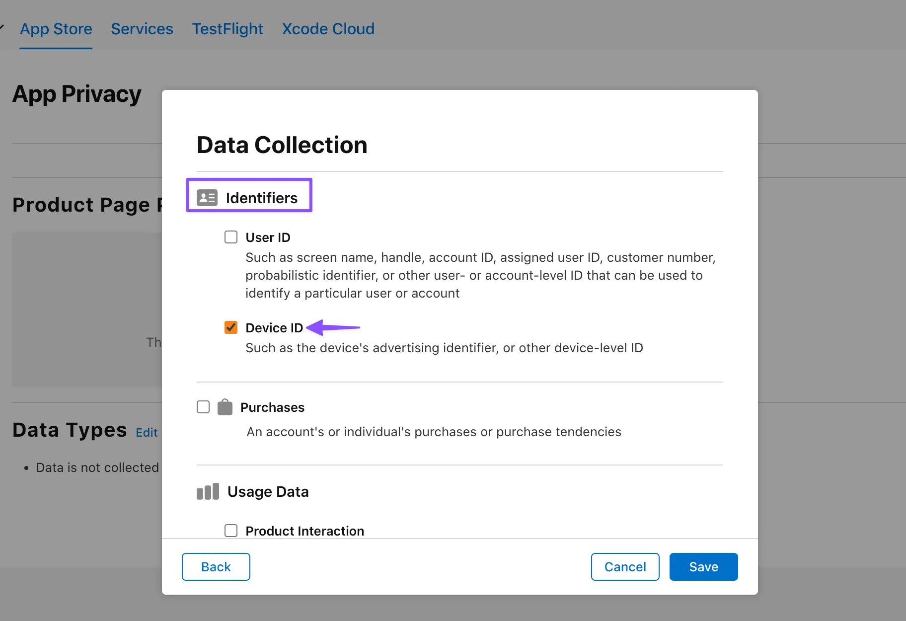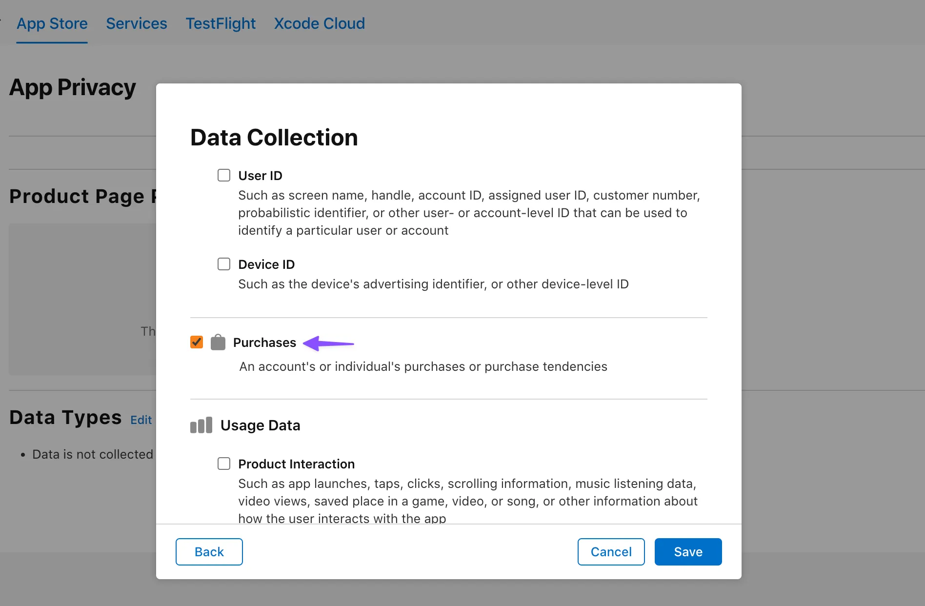 Apple app privacy disclosure in App Store Connect