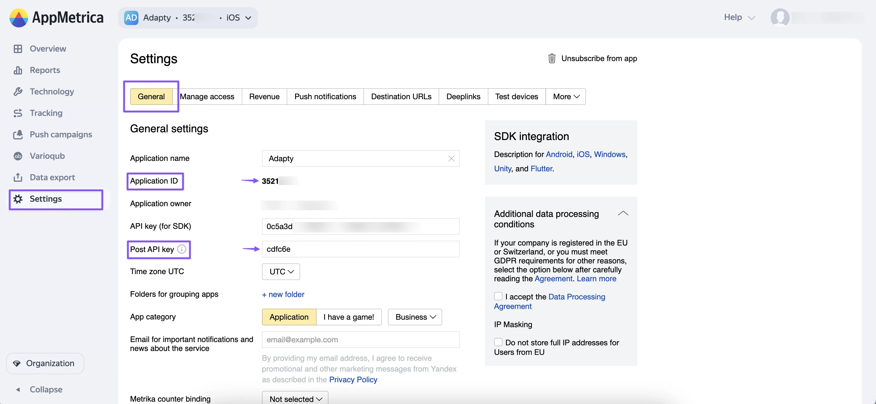 Open AppMetrica apps list. Choose the app you want to send events to and go to Settings. Copy Application ID and Post API key and use them to set up the integration in Adapty.