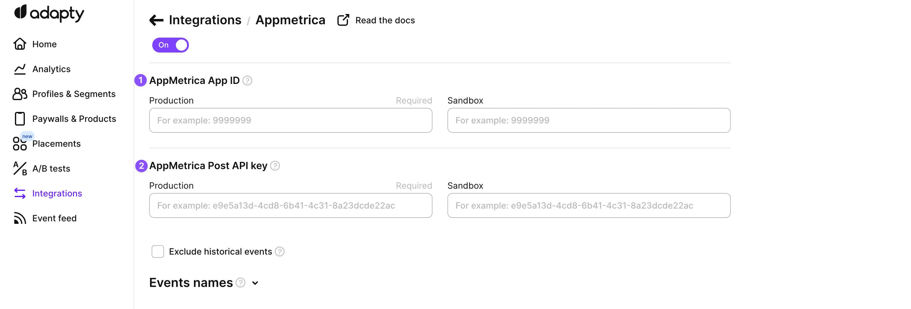 Below the credentials, there are three groups of events you can send to AppMetrics from Adapty. Simply turn on the ones you need. Check the full list of the events offered by Adapty here.