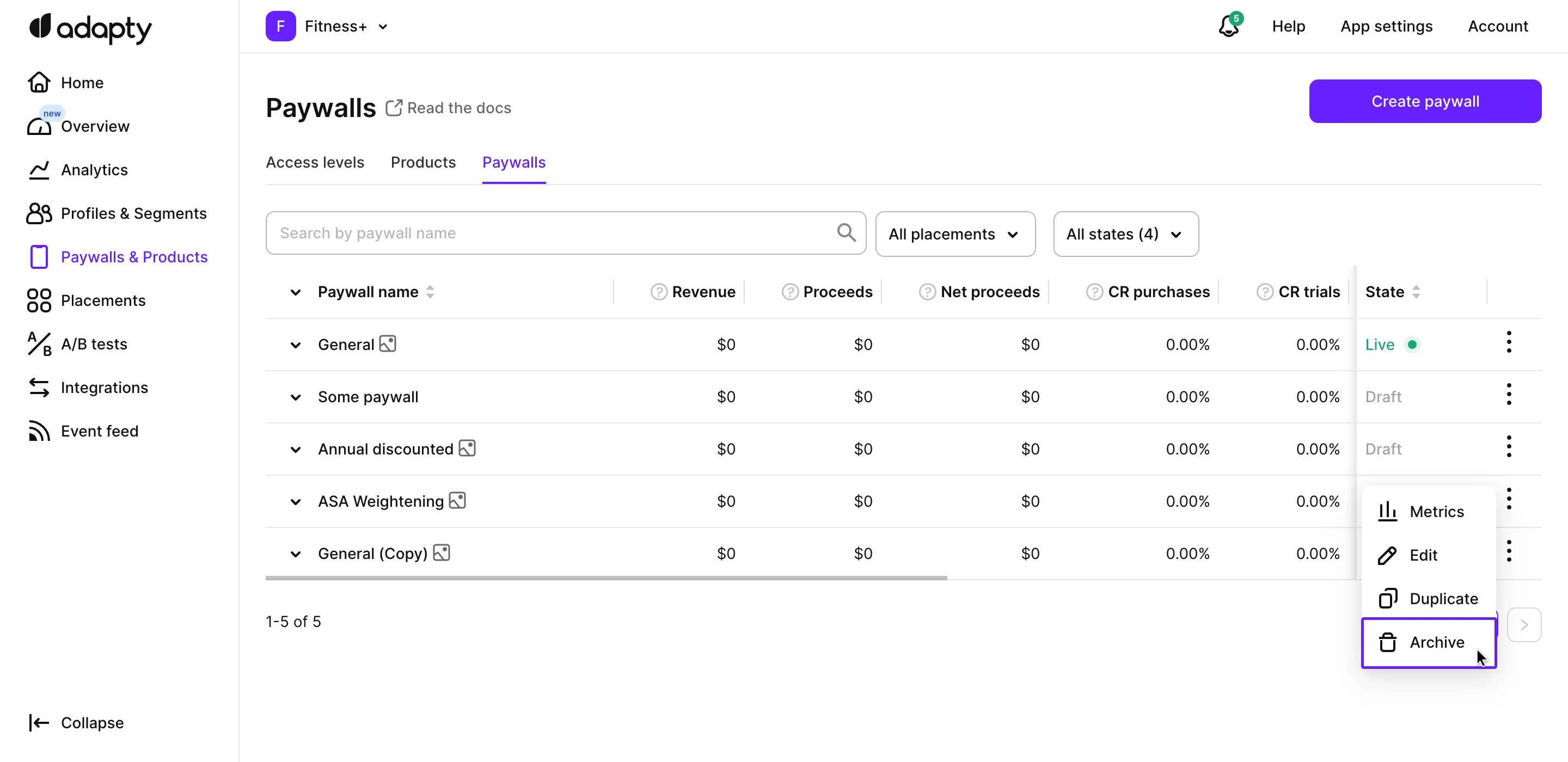 Archiving ensures they're safely stored without permanent deletion, ready to be accessed if needed in the future. Plus, archived paywalls can be filtered out from the default view, decluttering your workspace and simplifying your user interface. In this guide, we'll walk you through efficiently archiving paywalls in Adapty, giving you greater control over your paywall management process.