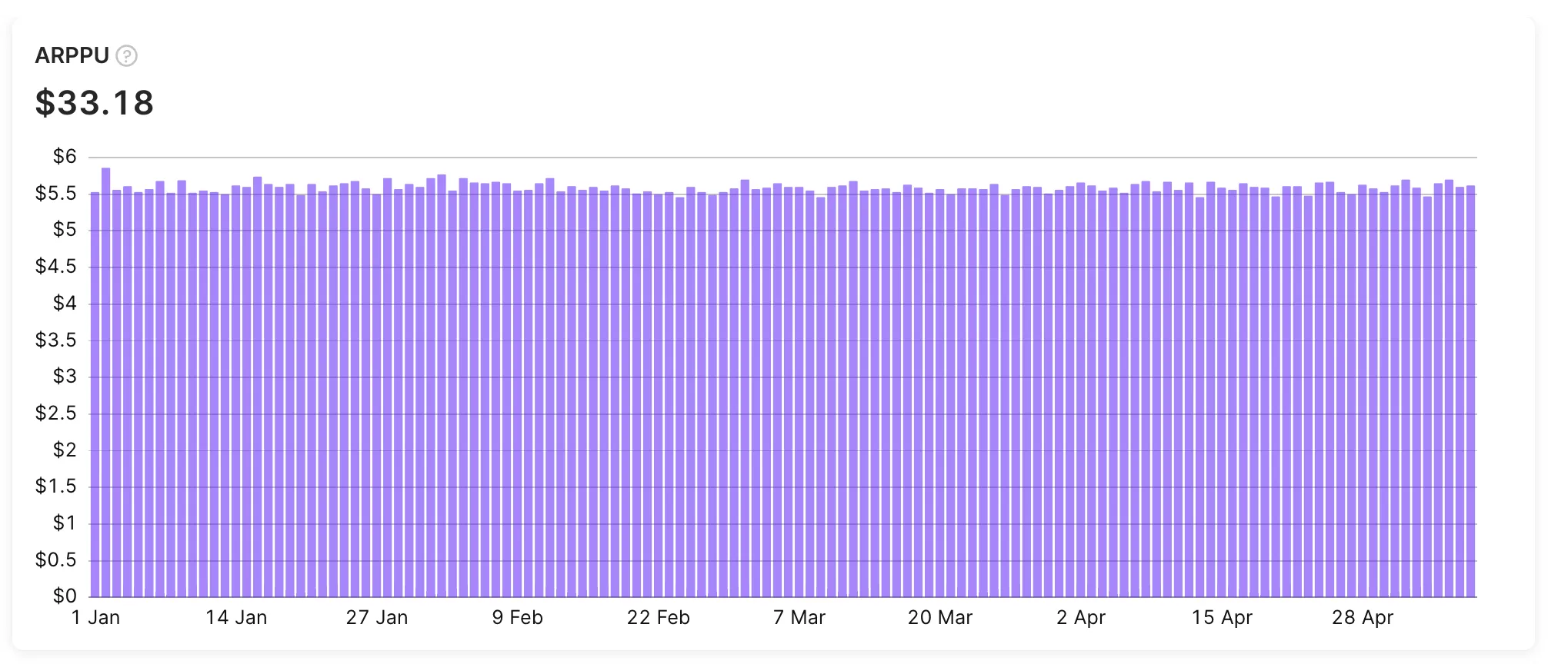 The Average revenue per paying user (ARPPU) chart displays the average revenue per paid user. It displays the actual revenue generated by paying customers, divided by the number of customers, minus refunds.