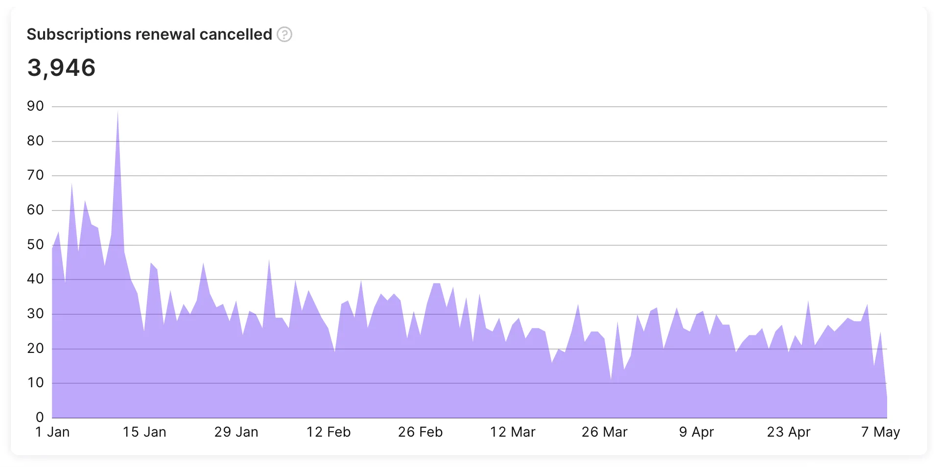 In addition to Subscription renewal canceled chart, Adapty also provides metrics for other subscription-related events, such as active subscriptions, new subscriptions, expired subscriptions, and non-subscriptions. To learn more about these subscriptions-related metrics, please refer to the following documentation guides: