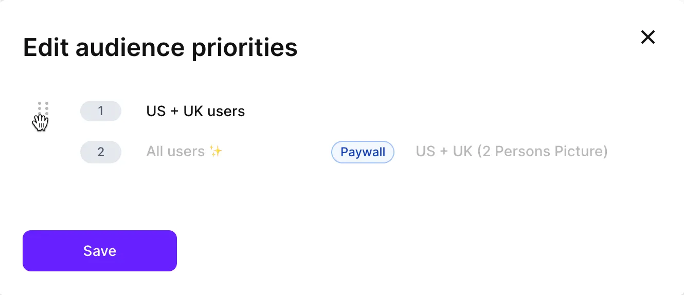 - In the opened Edit audience priorities window, drag-and-drop audiences to reorder them correctly.