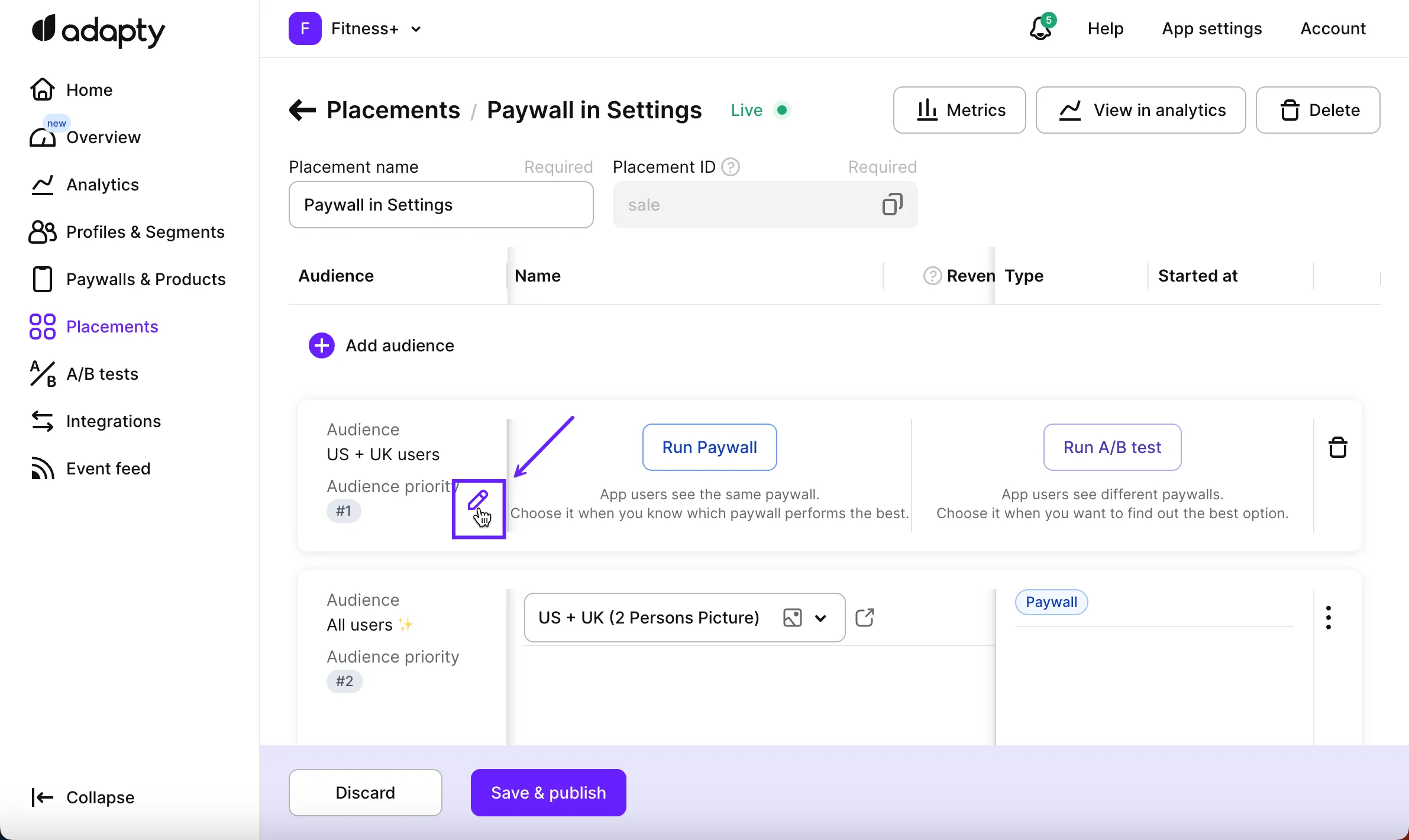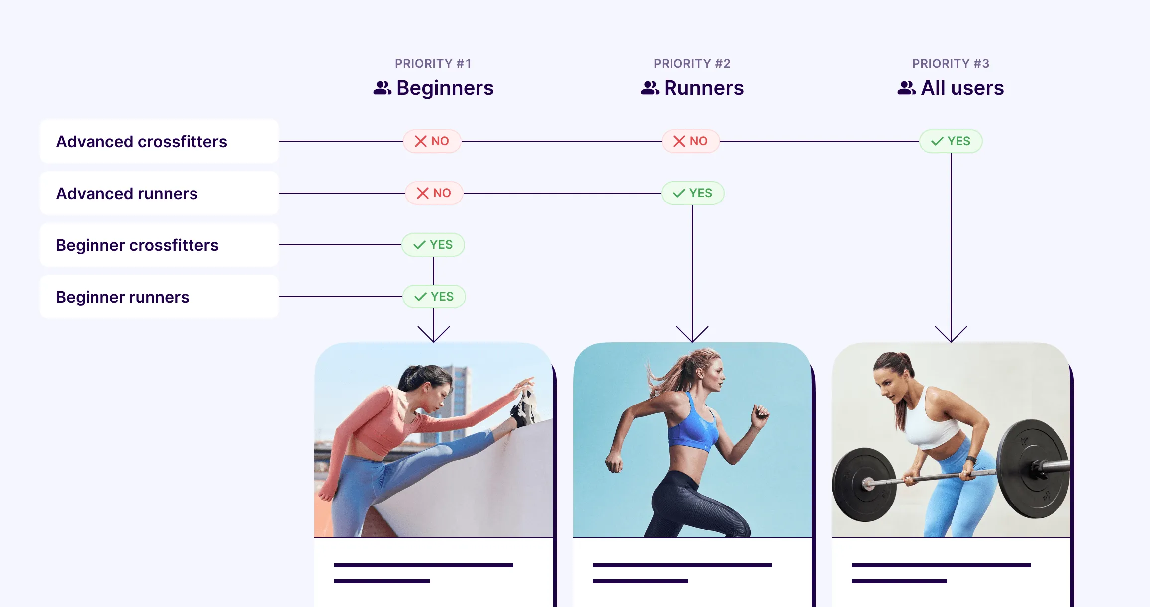 When you have different user audiences in one placement, a user can belong to more than one audience. For instance, if you've defined audiences like "Female", "Runners", and a general audience like "All users," it's crucial to determine which specific audience to consider first when a user falls into multiple categories.