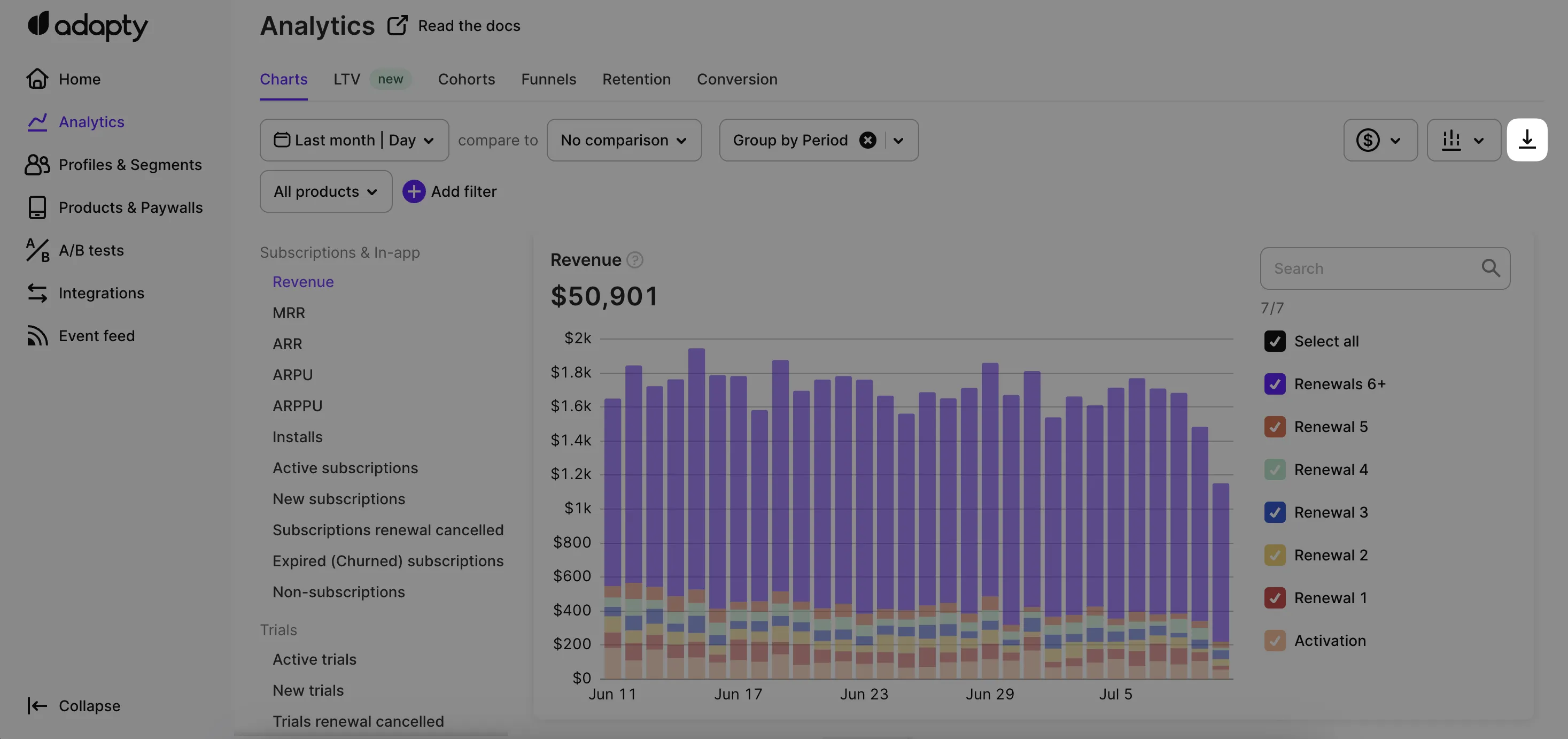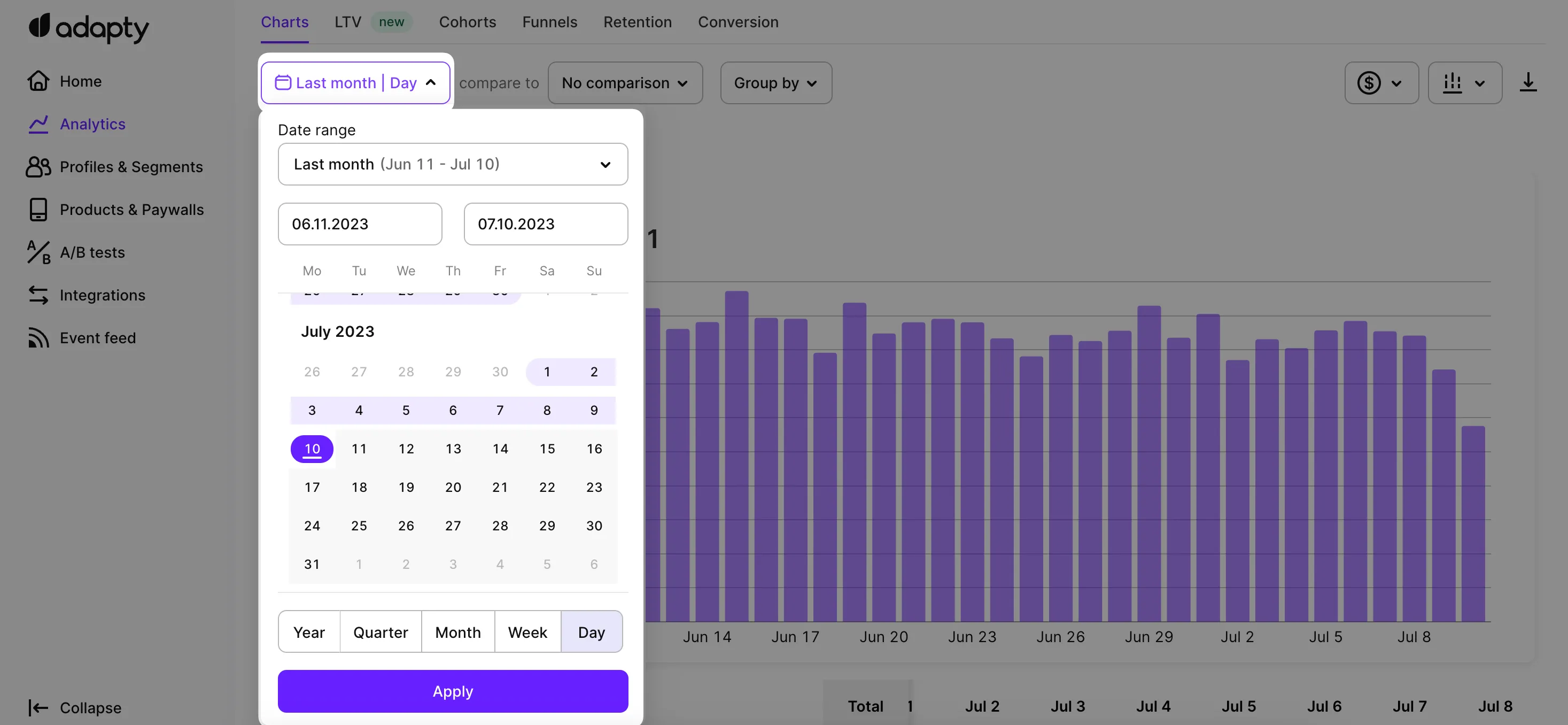 Adapty offers a wide range of controls to help you gain valuable insights and unlock the full potential of your data and gain a comprehensive view of your business performance. Whether you're analyzing charts, cohorts, funnels, retention, conversion data, or LTV, these controls provide powerful functionality. By leveraging these controls, you can dive deeper into your data and extract meaningful insights to drive your business decisions.