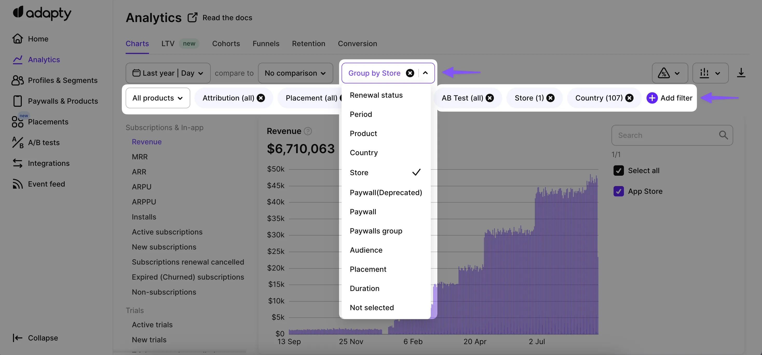 | Paywall | ✅ | ✅ | Filter or group metrics by paywalls that are associated with purchases. |
