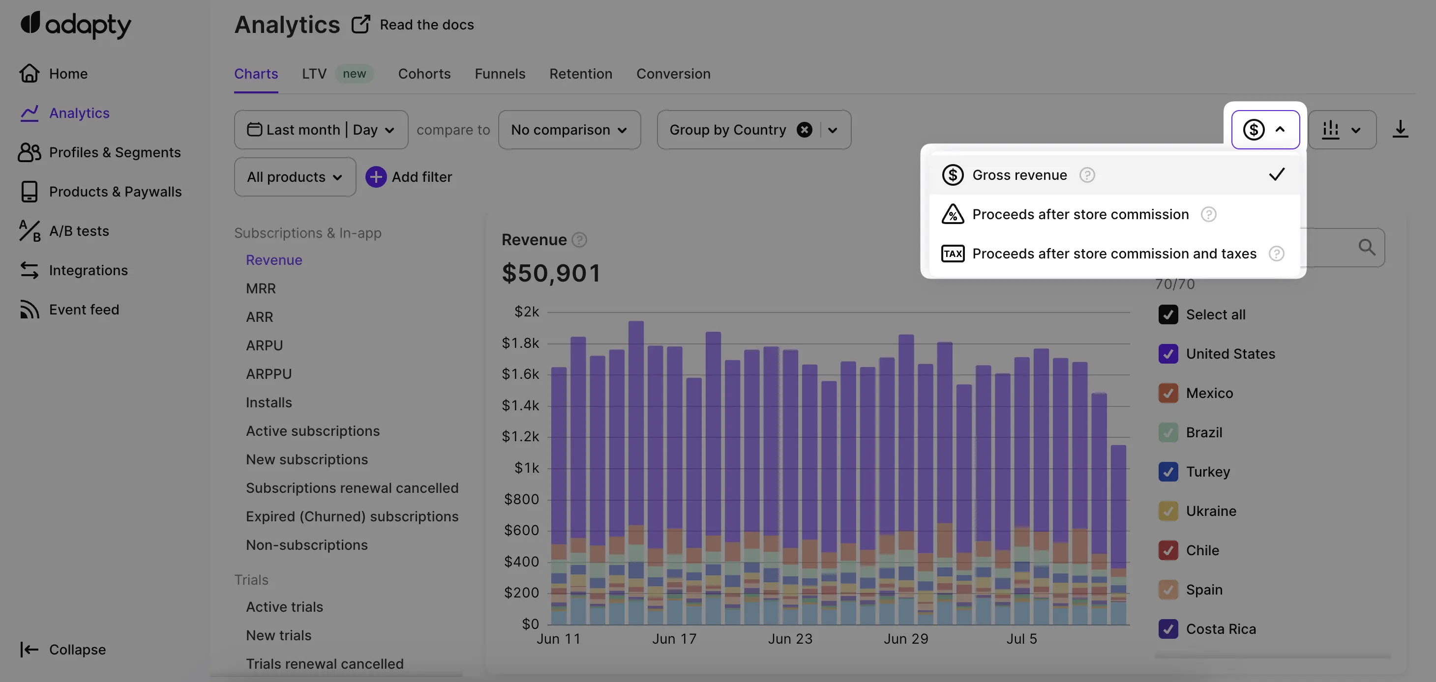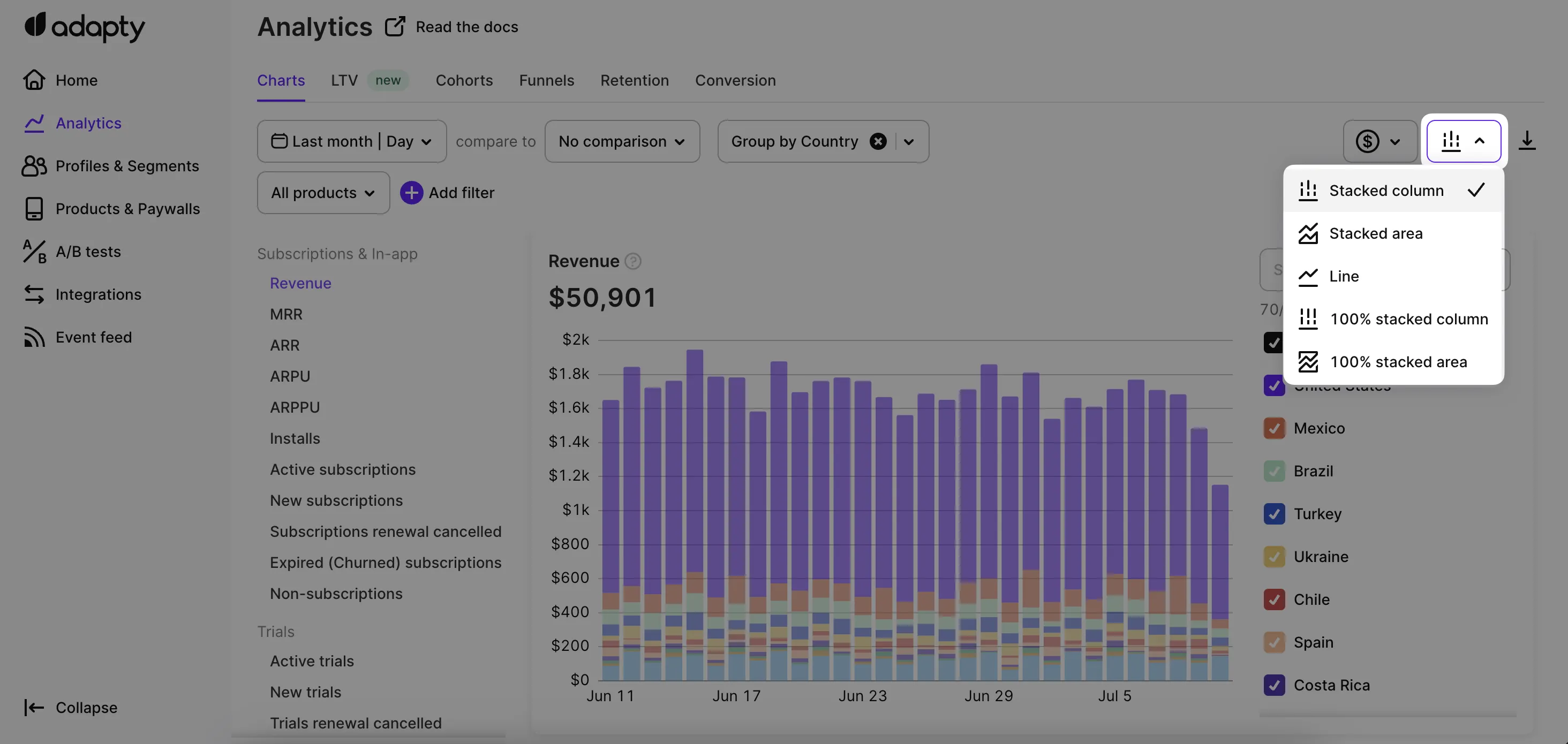 In the charts tab of the Analytics section, Adapty introduces a dropdown field with three display options.