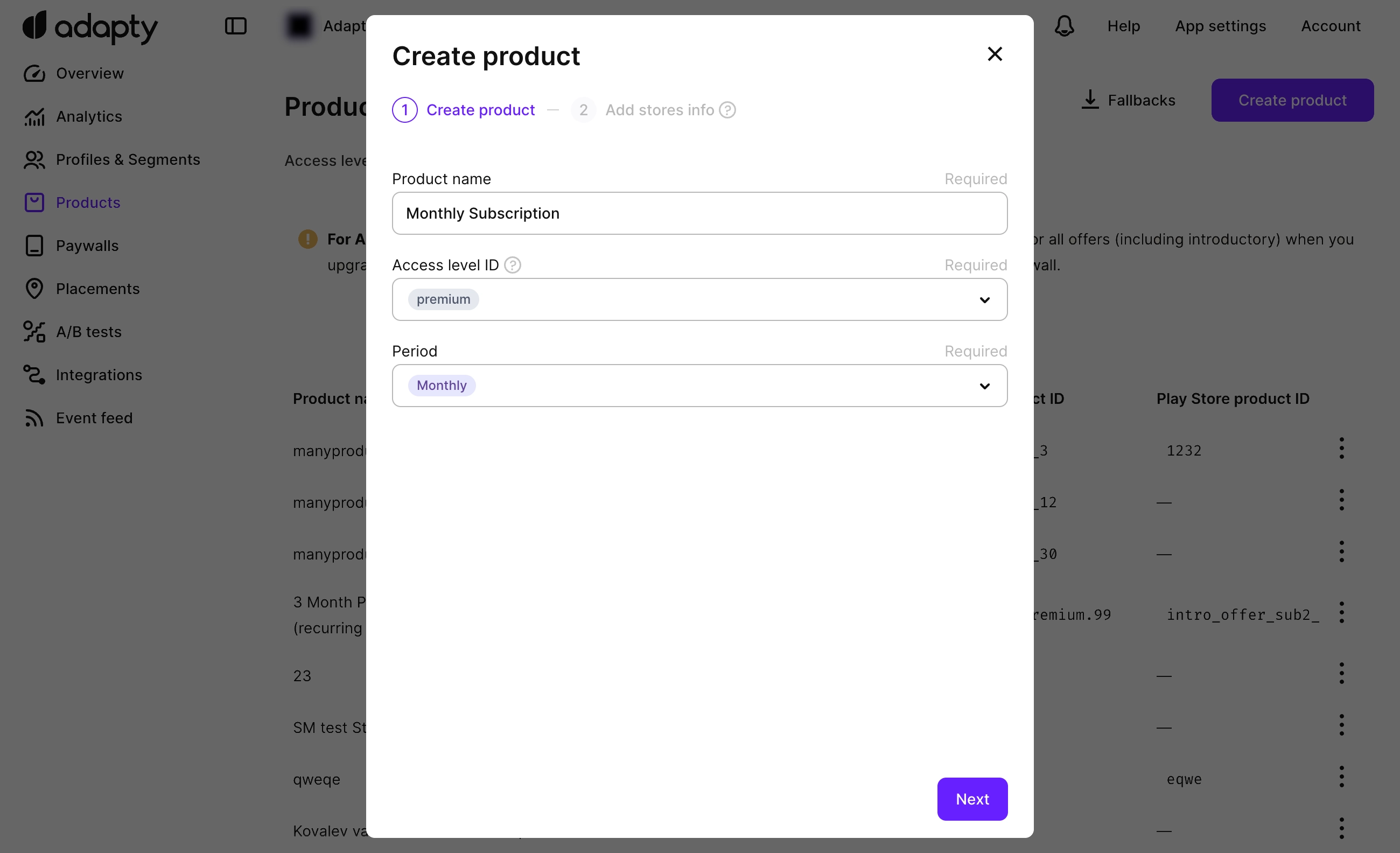 premiumaccess level is created in Adapty by default, but you can also add more access levels. -