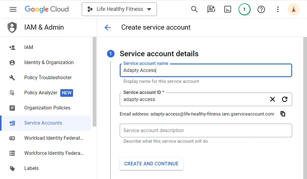 In the Service account details sub-section of the Create service account window, enter the Service Account Name you want. We recommend including "Adapty" in the name to indicate the purpose of this account. The Service account ID will be created automatically.