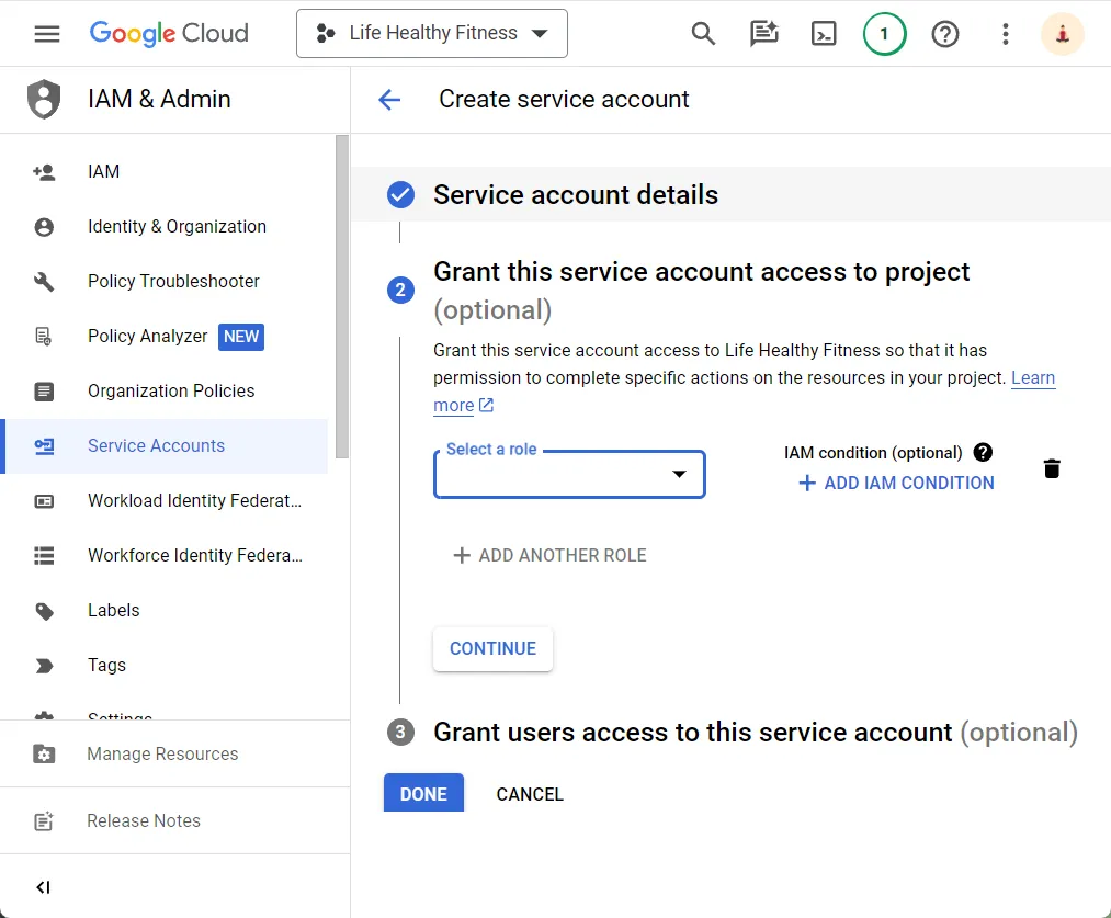 In the Select a role drop-down list of the Grant this service account access to project sub-section, select Pub/Sub -> Pub/Sub Admin. This role is required to enable real-time developer notifications.