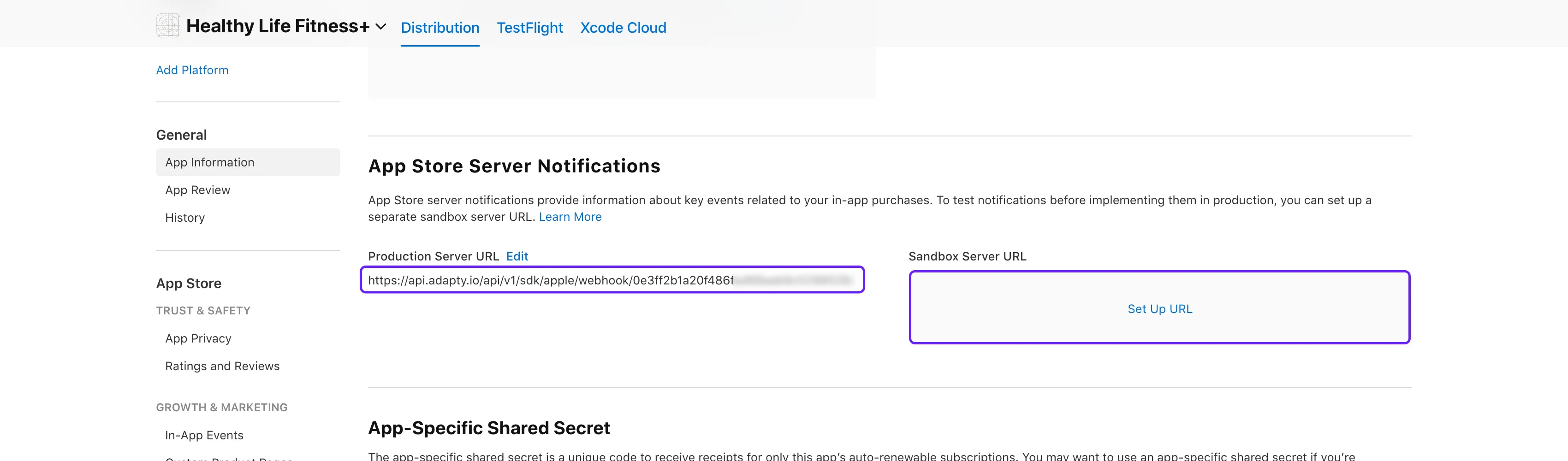 Paste the copied URL for App Store server notification into the Production Server URL and Sandbox Server URL fields.