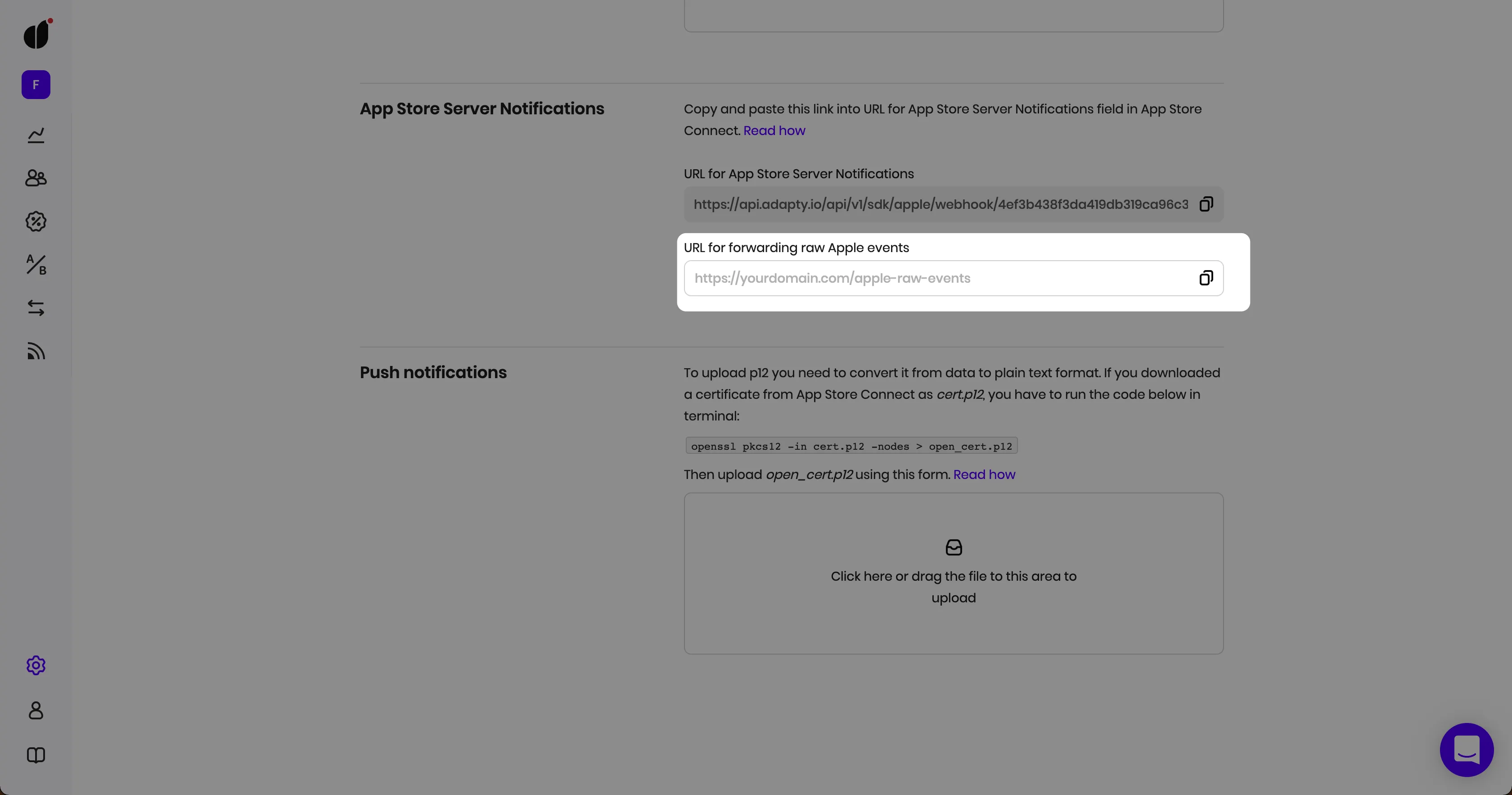 Sometimes, you might still want to receive raw S2S events from Apple. To continue receiving them while using Adapty, just add your endpoint to the URL for forwarding raw Apple events field, and we'll send raw events as-is from Apple.