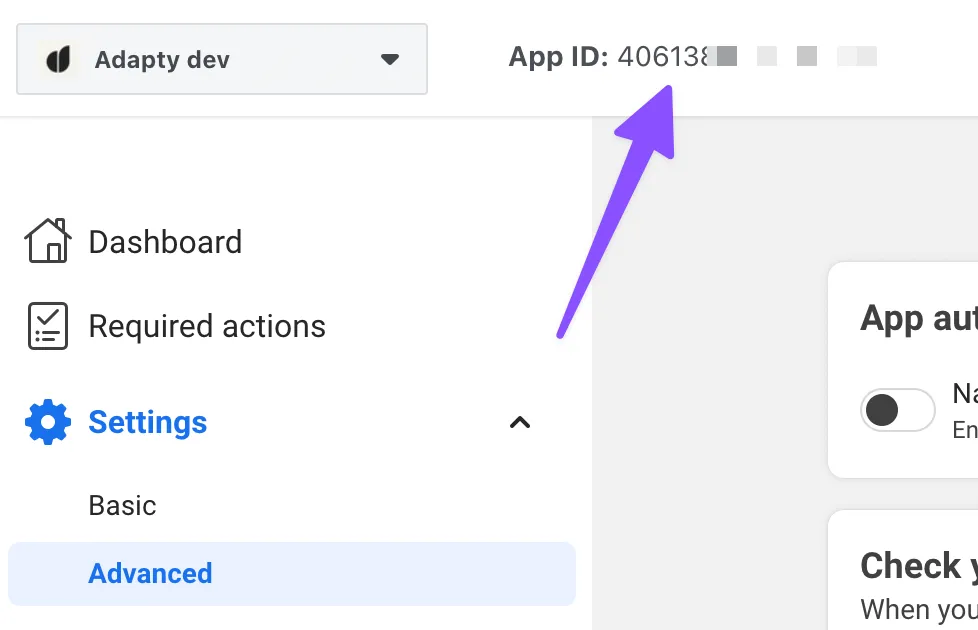- You need an application on Facebook Developers platform. Log in to your app and then find advanced settings. You can find the App ID in the header.