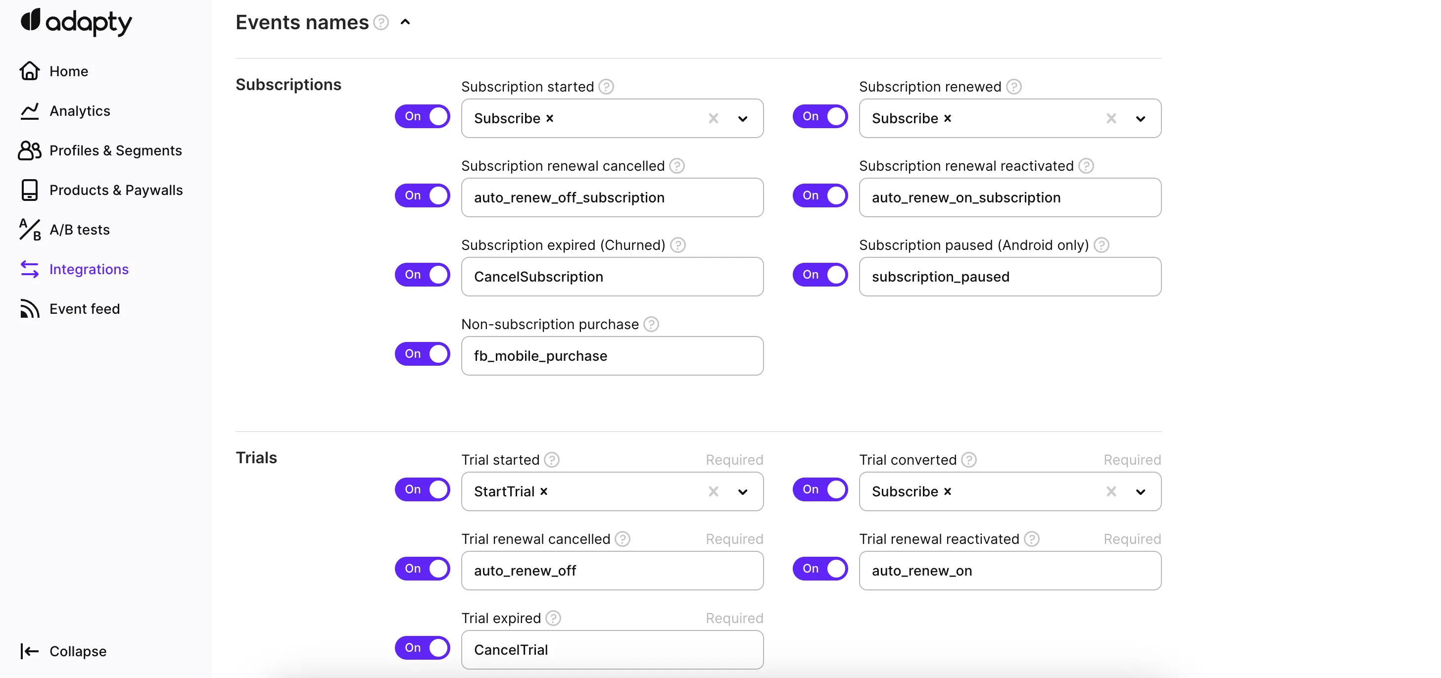 To enable specific events, simply toggle on the ones you require. In case multiple event names are selected, Adapty will consolidate the data from all the chosen events into a single Adapty event name.