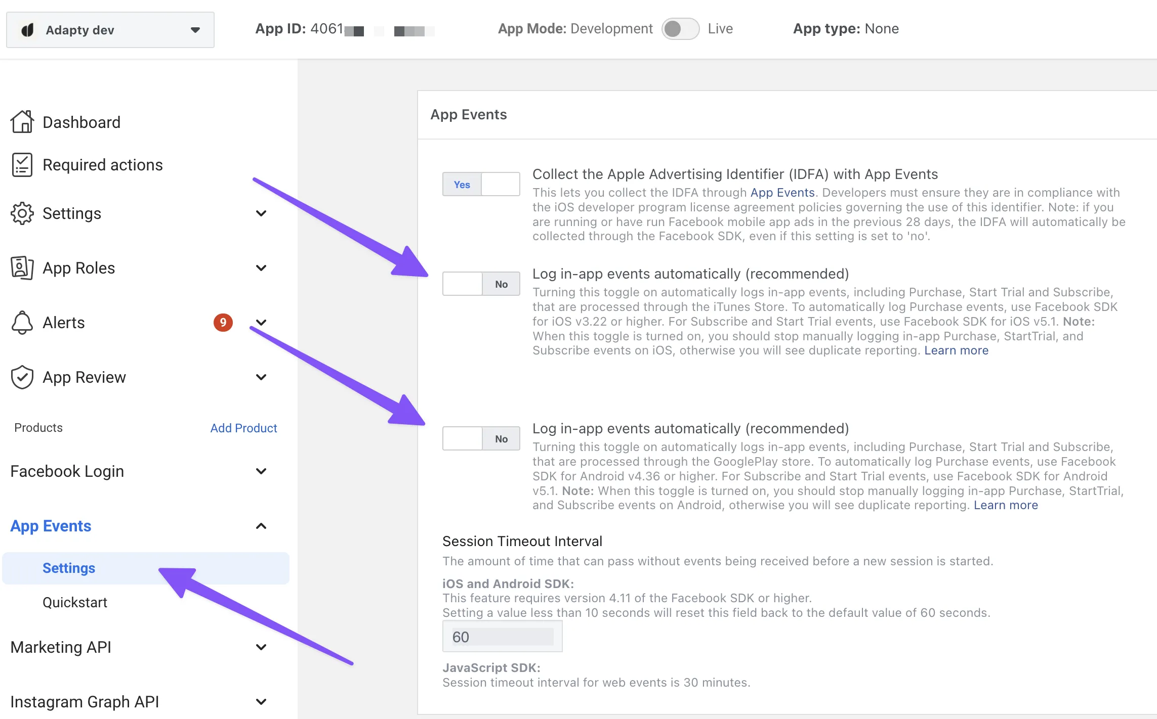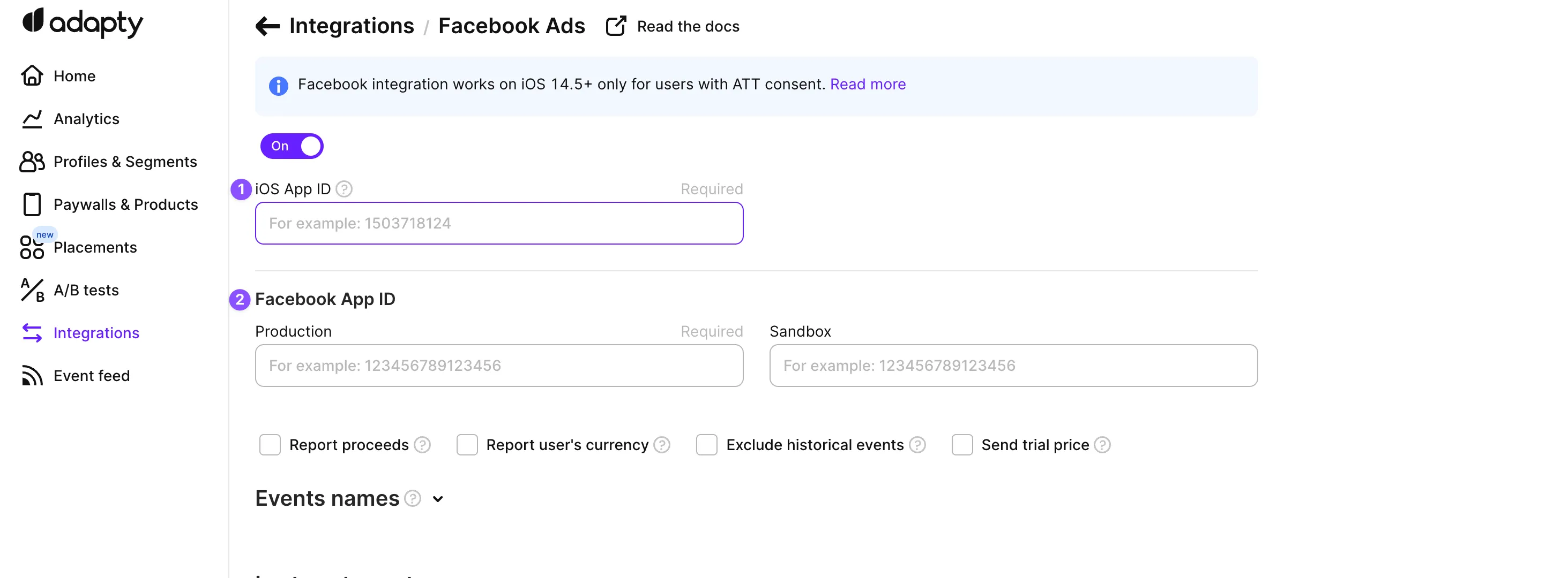 Because of iOS IDFA changes in iOS 14.5, if you use Facebook integration, make sure you send facebookAnonymousId to Adapty via .setIntegrationIdentifier() method. It allows Facebook to handle events if IDFA is not available.
